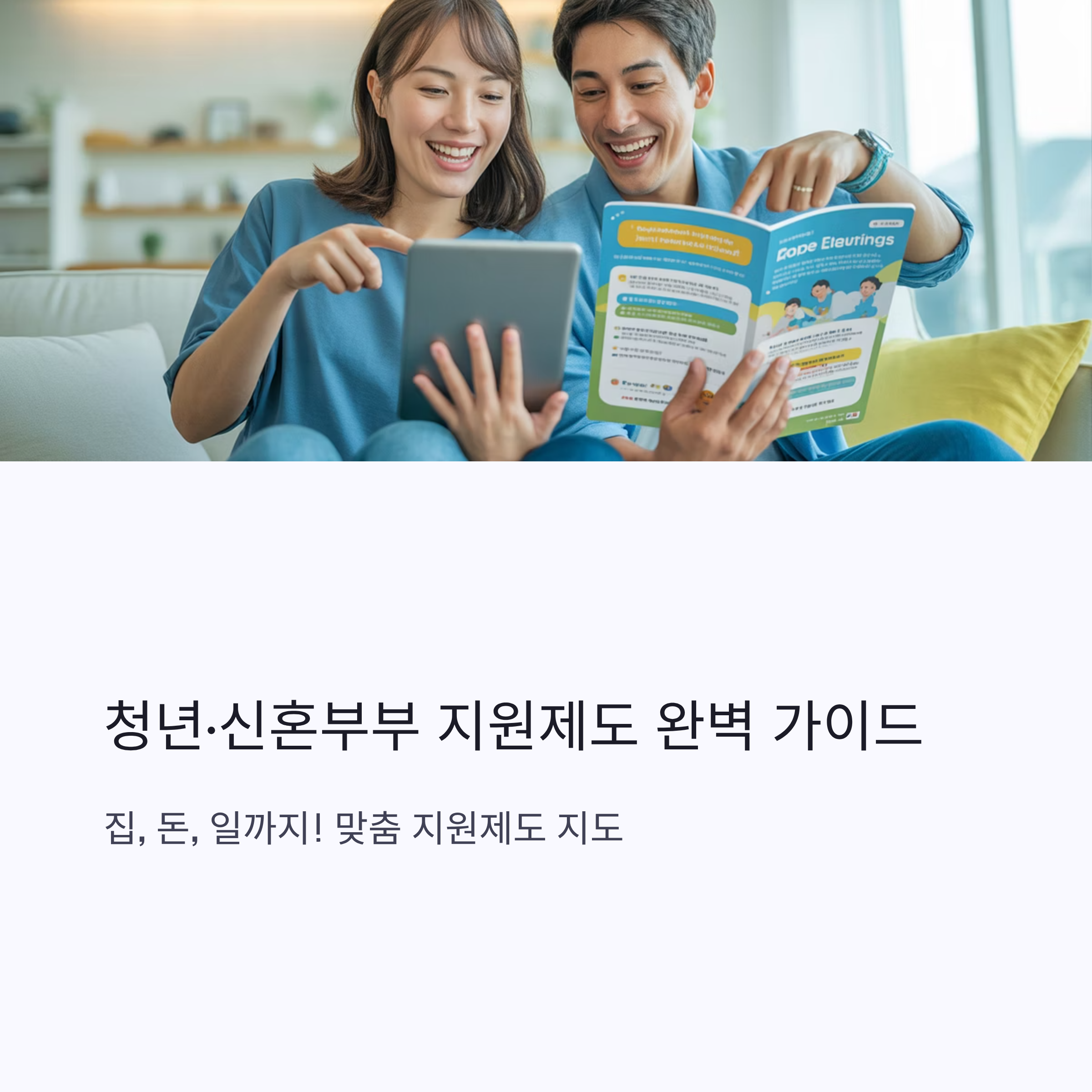 집, 돈, 일까지! 청년과 신혼부부를 위한 맞춤 지원제도 지도청년과 신혼부부를 위한 정부·지자체 지원제도는 다양하지만, 흩어져 있어 한눈에 파악하기 어렵습니다.주거, 금융, 고용 세 가지 분야를 중심으로 주요 제도를 정리해 드립니다.이 글을 통해 자신에게 맞는 정책을 찾아 실질적인 혜택을 누리시길 바랍니다.청년 주거 지원 제도집 문제는 청년과 신혼부부에게 가장 큰 고민이죠.정부는 보증금 부담 완화와 안정적인 주거 환경 제공을 위해 여러 제도를 마련하고 있습니다.제도명 주요 내용 대상청년 전세임대주택LH가 전세계약을 대신 체결 후 저렴하게 임대만 19~39세 무주택 청년청년 월세 지원최대 월 20만원 한시 지원부모와 별도 거주 청년신혼부부 매입임대다가구·다세대 주택을 저렴하게 공급혼인 7년 이내 신혼부부행..