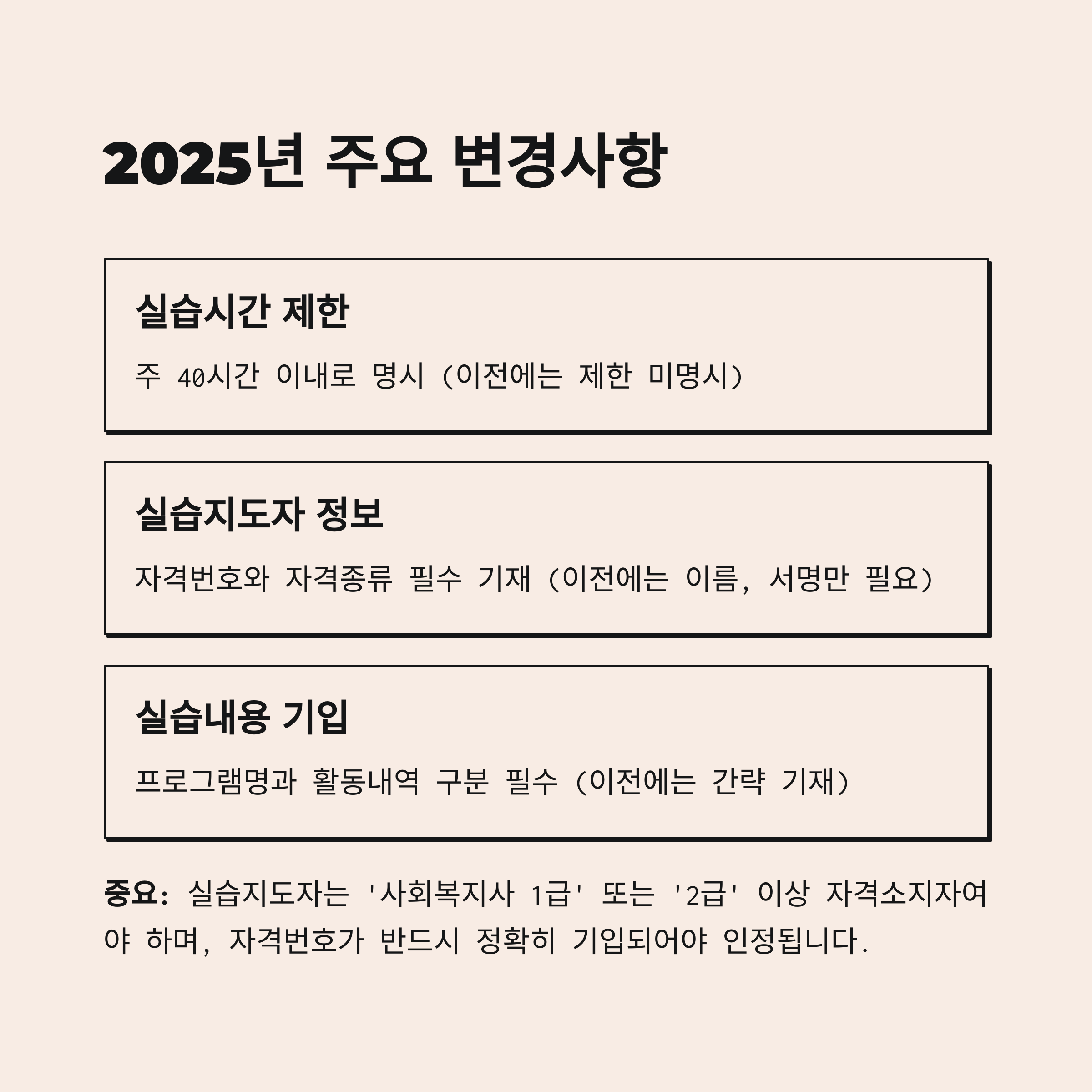 실습지도자의 자격 기입 방식, 실습내용 기재방식에 변화가 있습니다.