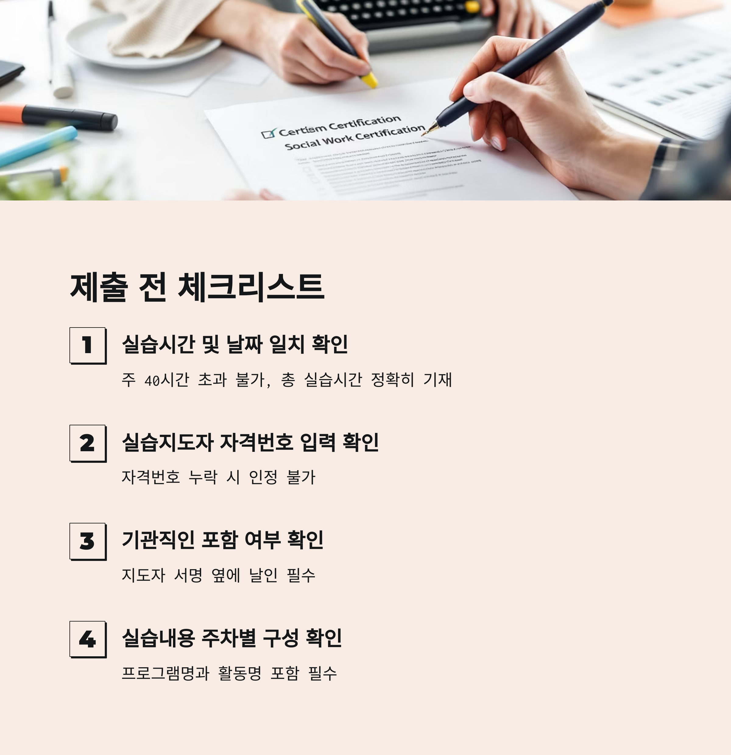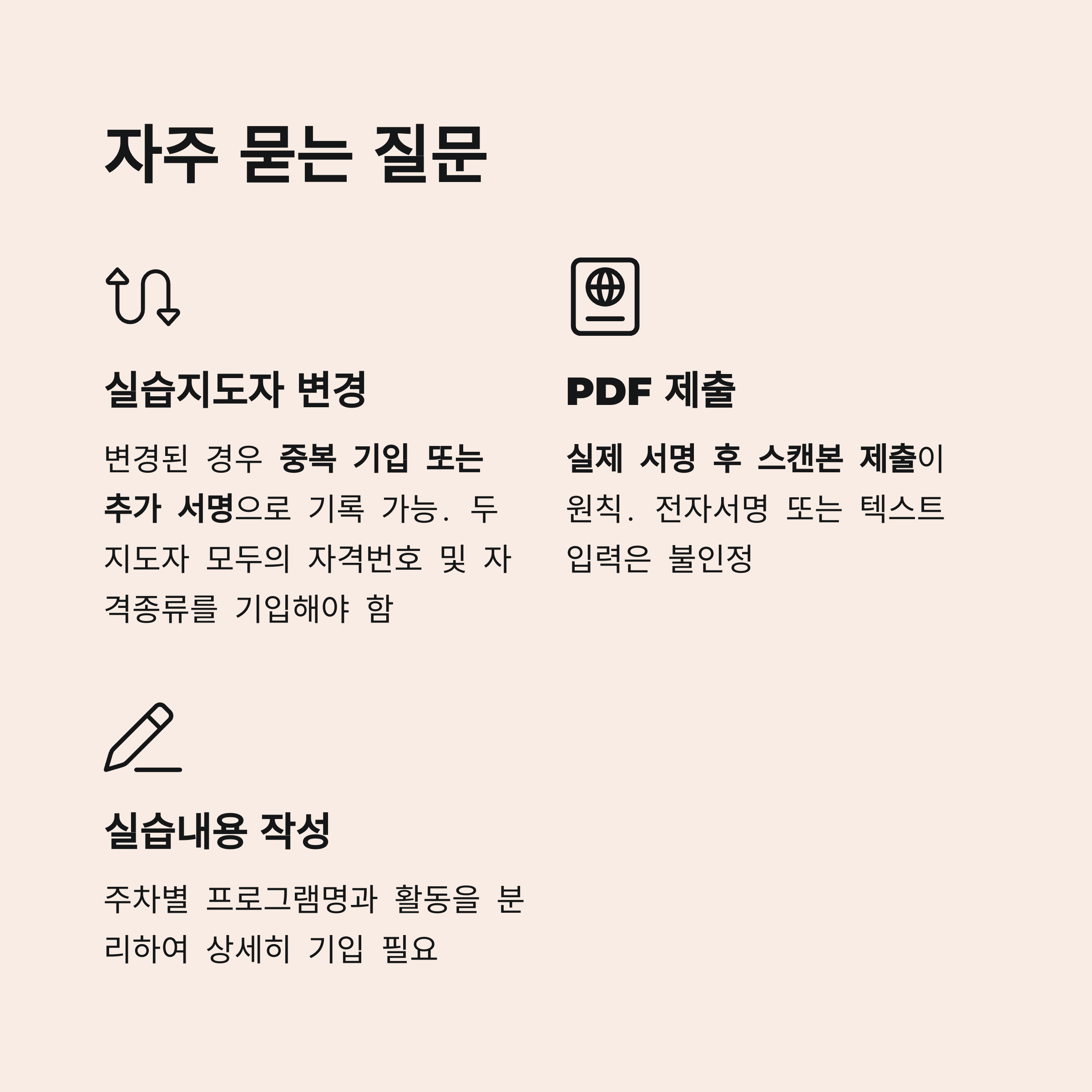 | 실습지도자 항목 | 이름, 서명만 필요 | 자격번호, 자격종류 필수 기재 |
