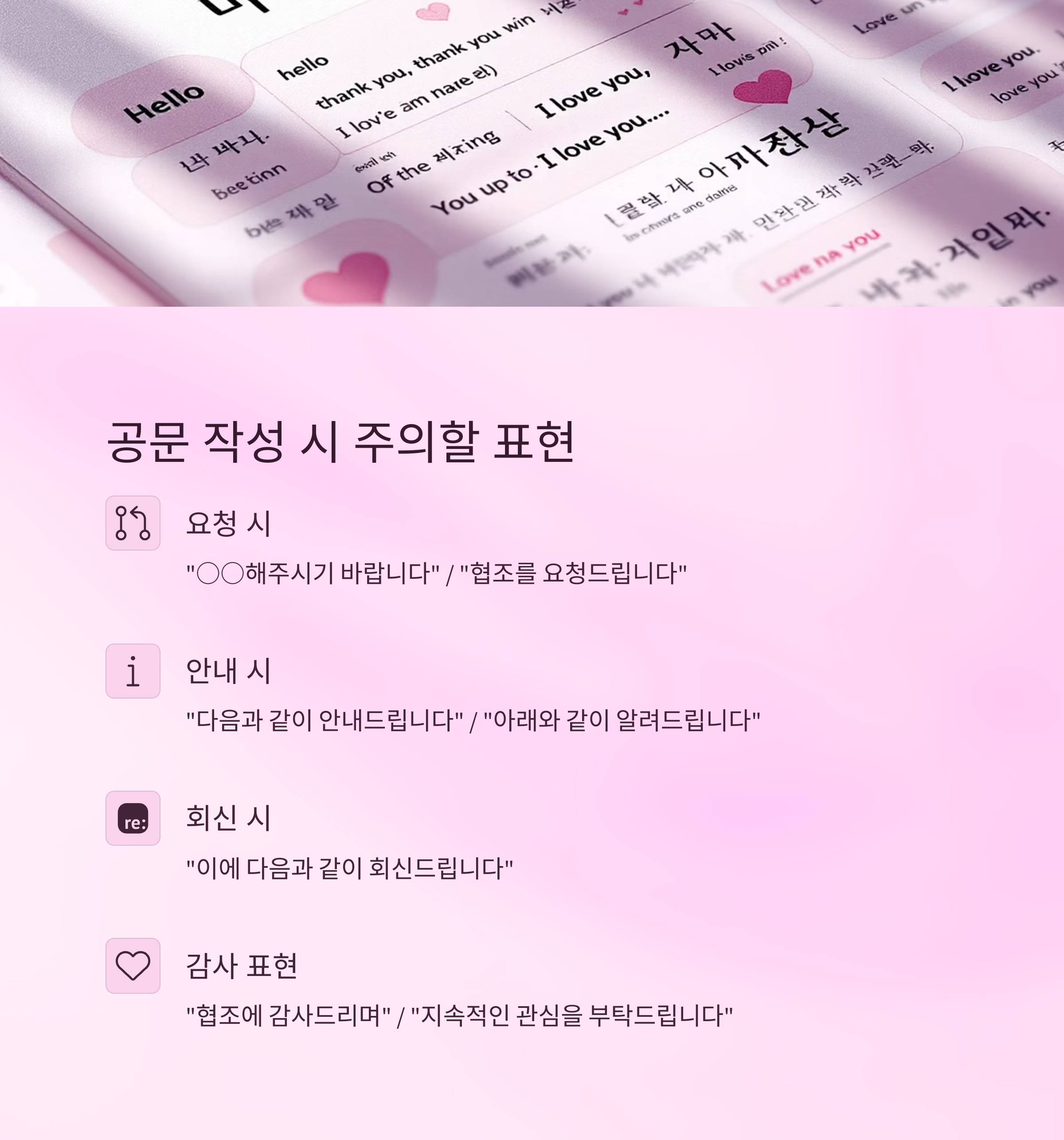 요청, 안내, 회신, 협조 등 상황별 공문 문장을 예시로 확인하세요