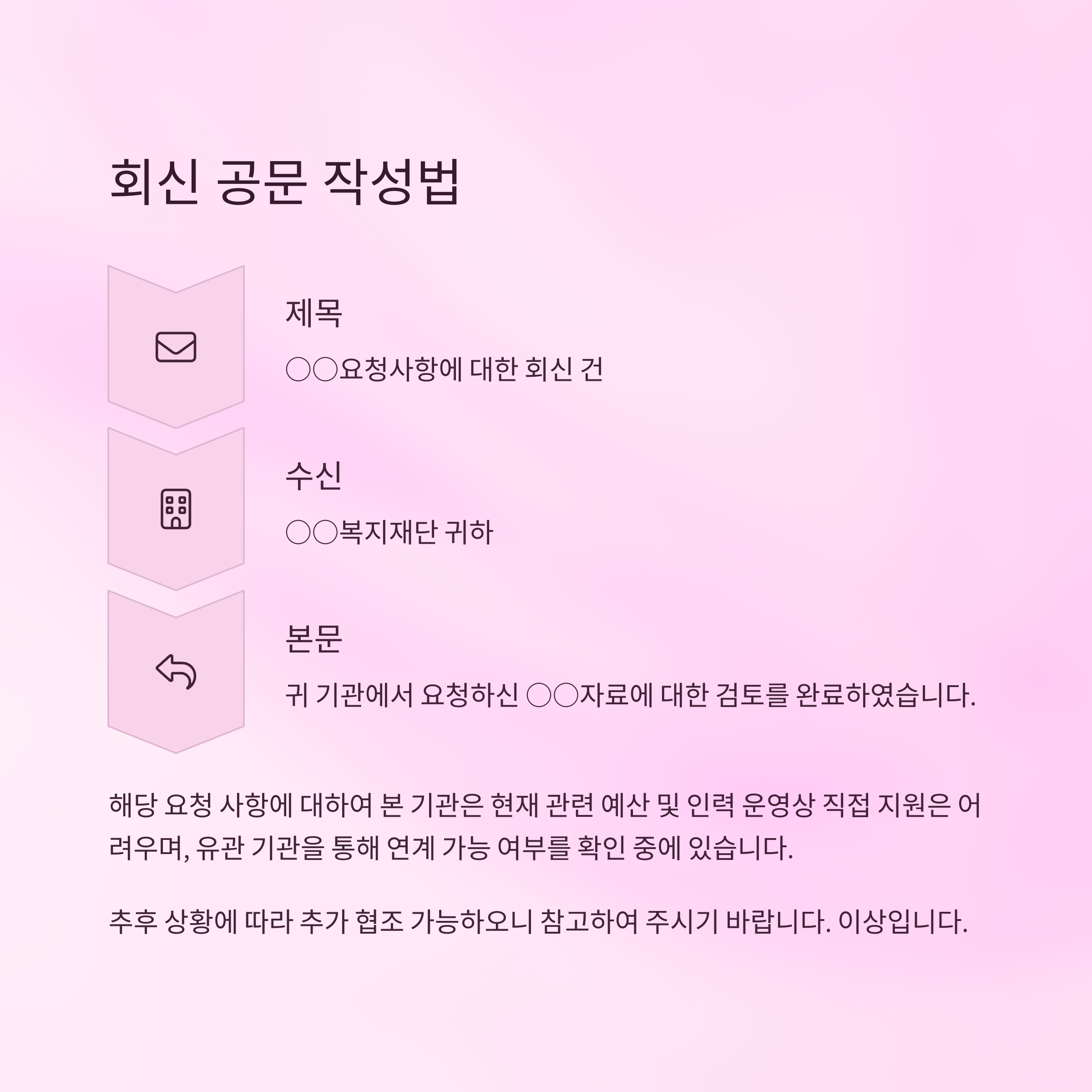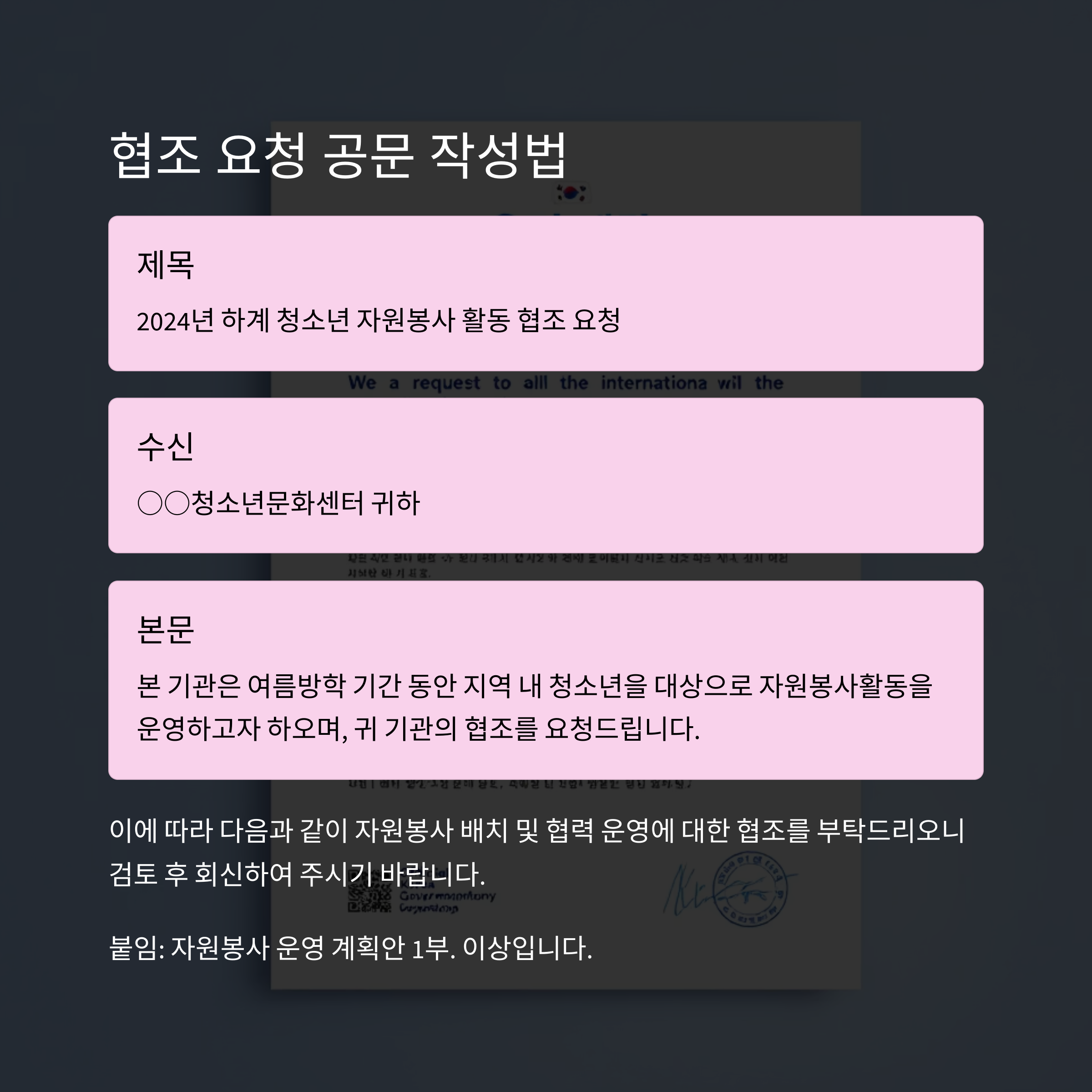 요청, 안내, 회신, 협조 등 상황별 공문 문장을 예시로 확인하세요