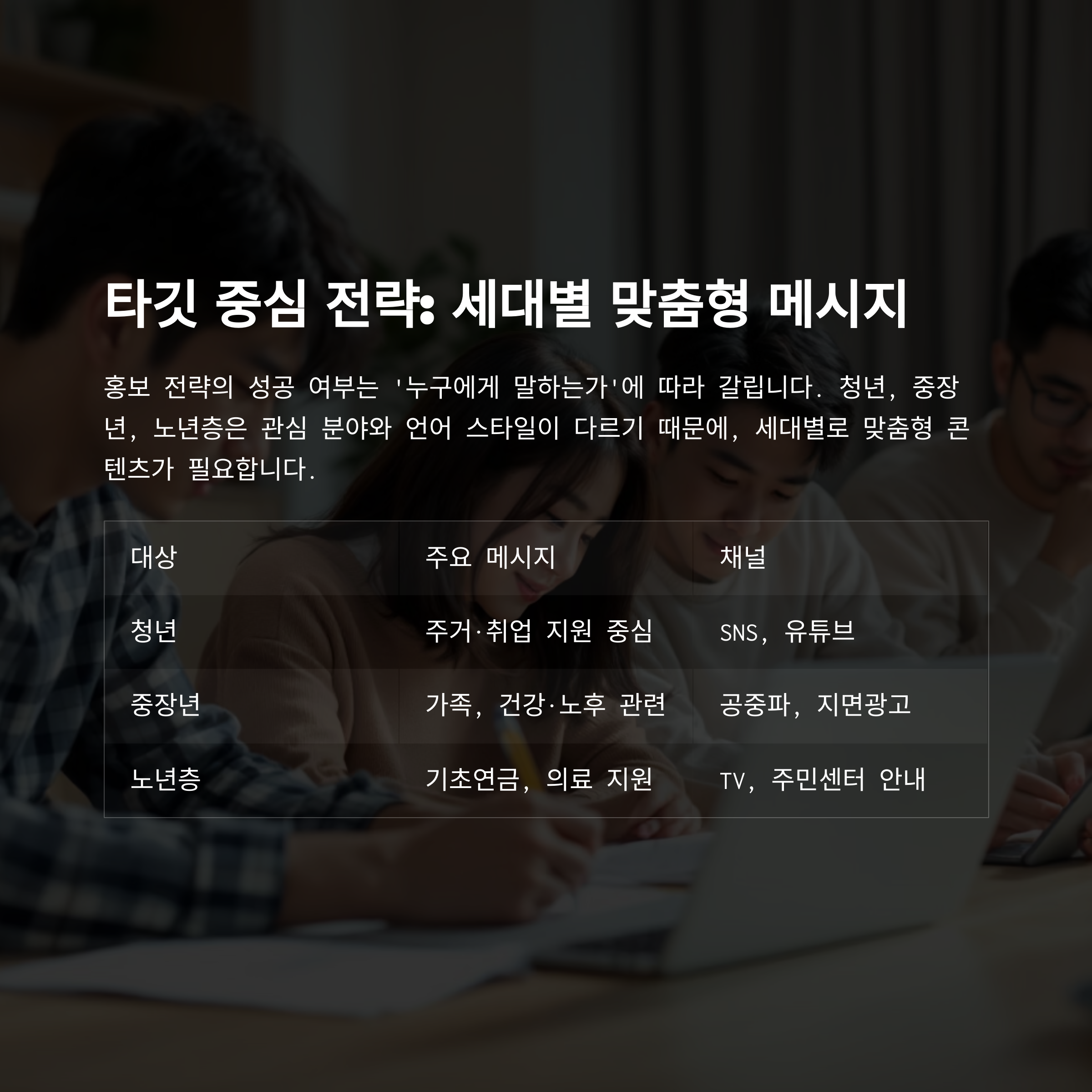 | 청년 | 주거·취업 지원 중심 | SNS, 유튜브 |