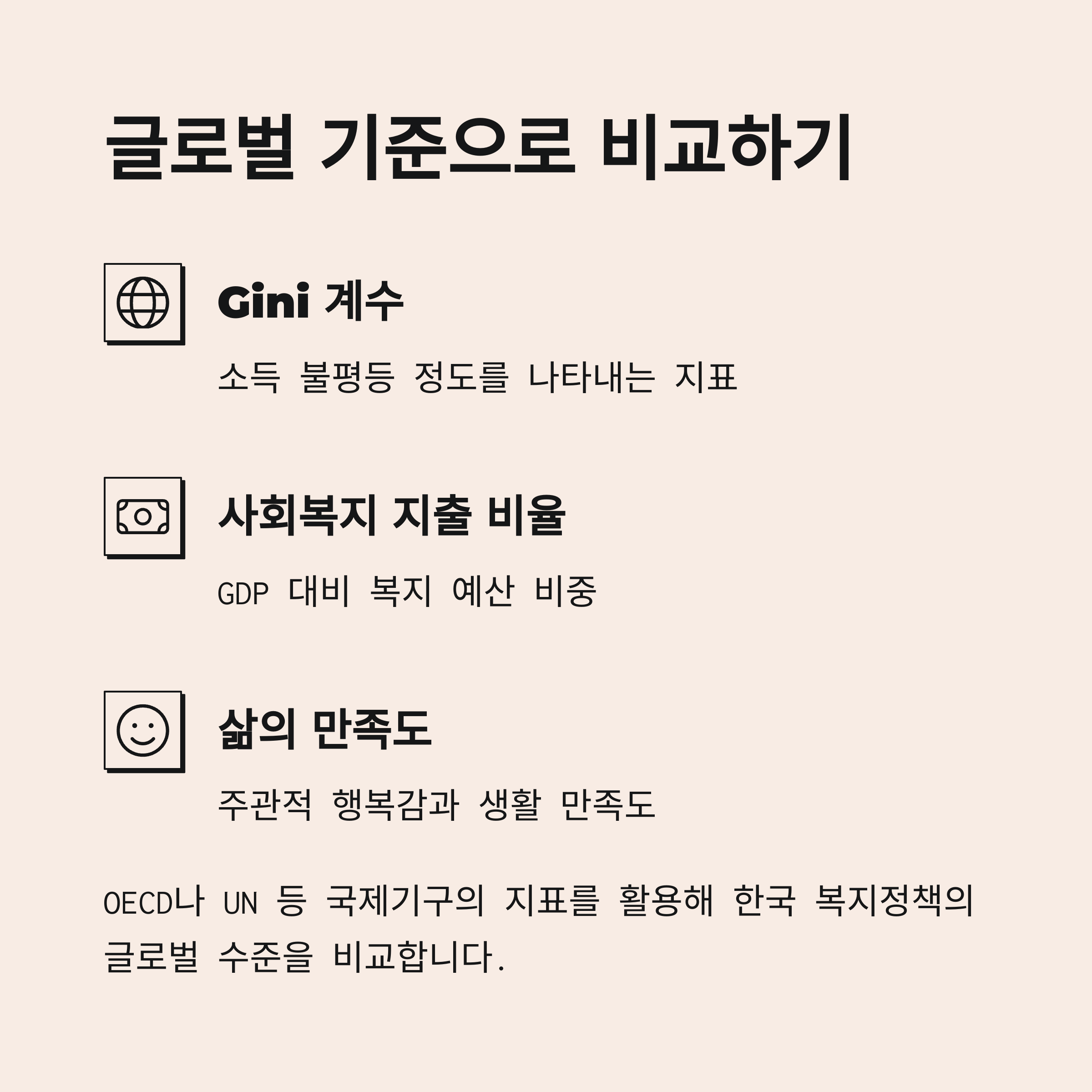 이는 "우리 복지가 글로벌 기준에서 어느 수준인가?"를 파악하는 데 유용합니다.