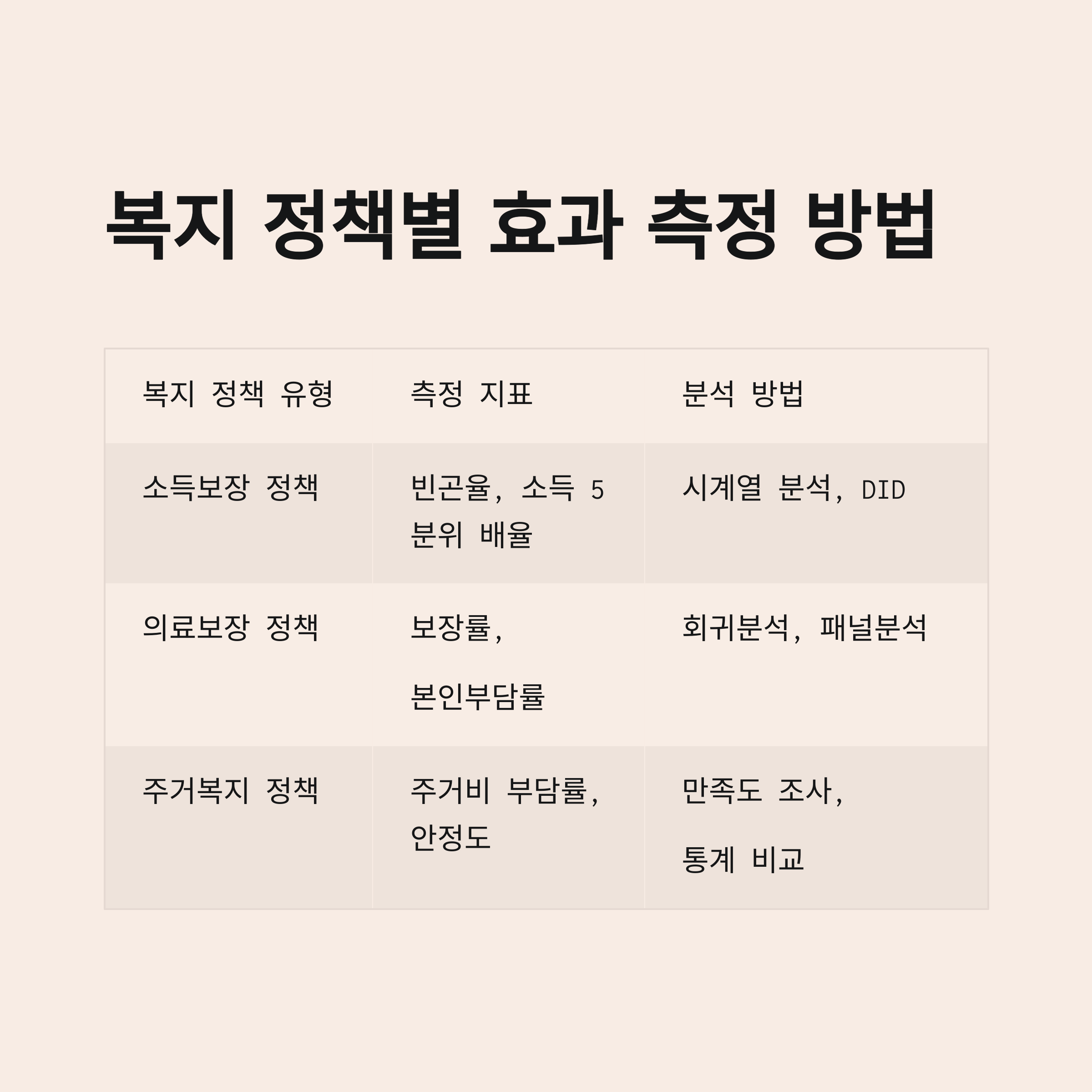 아래는 복지 정책별 효과 측정 지표와 분석 방법을 요약한 표입니다.