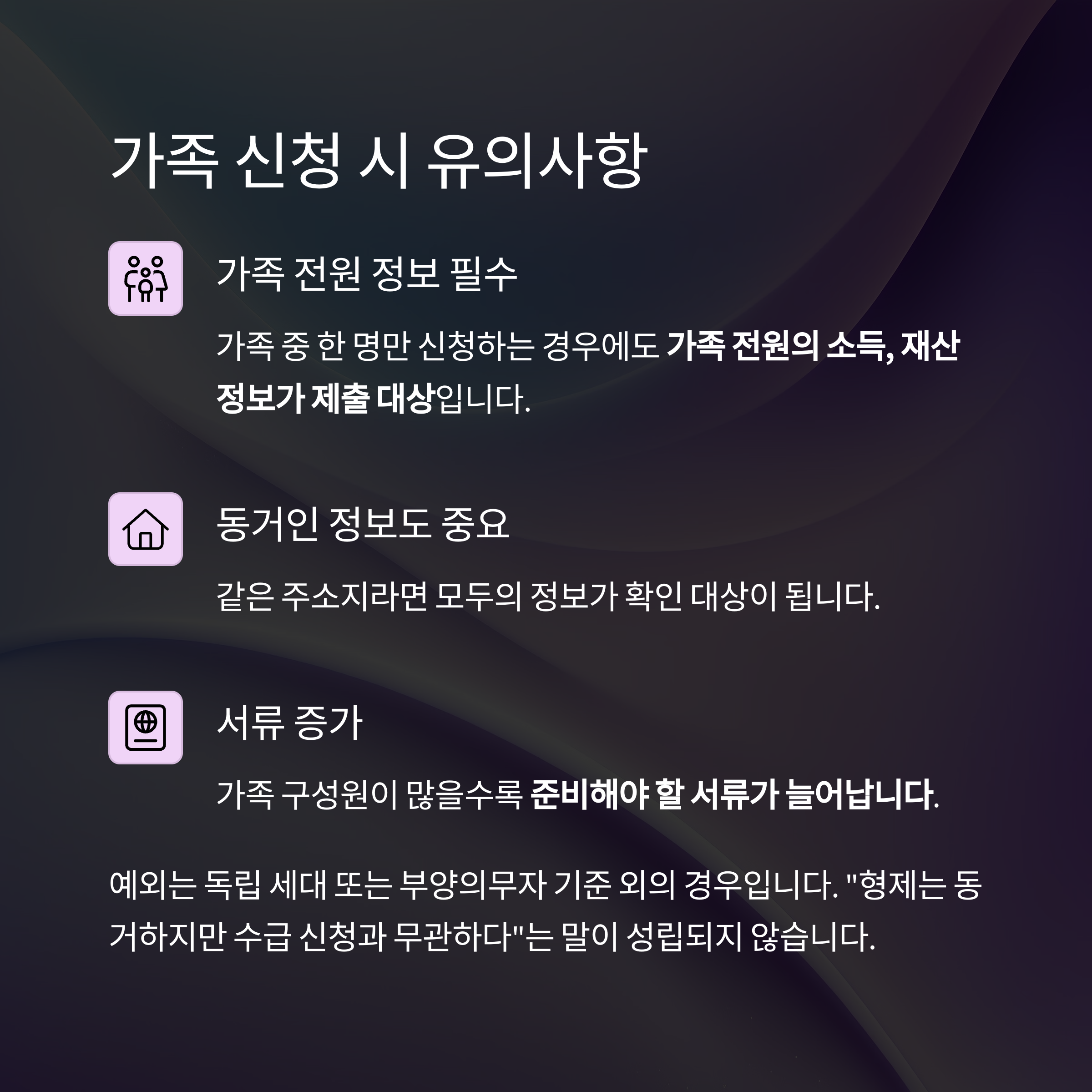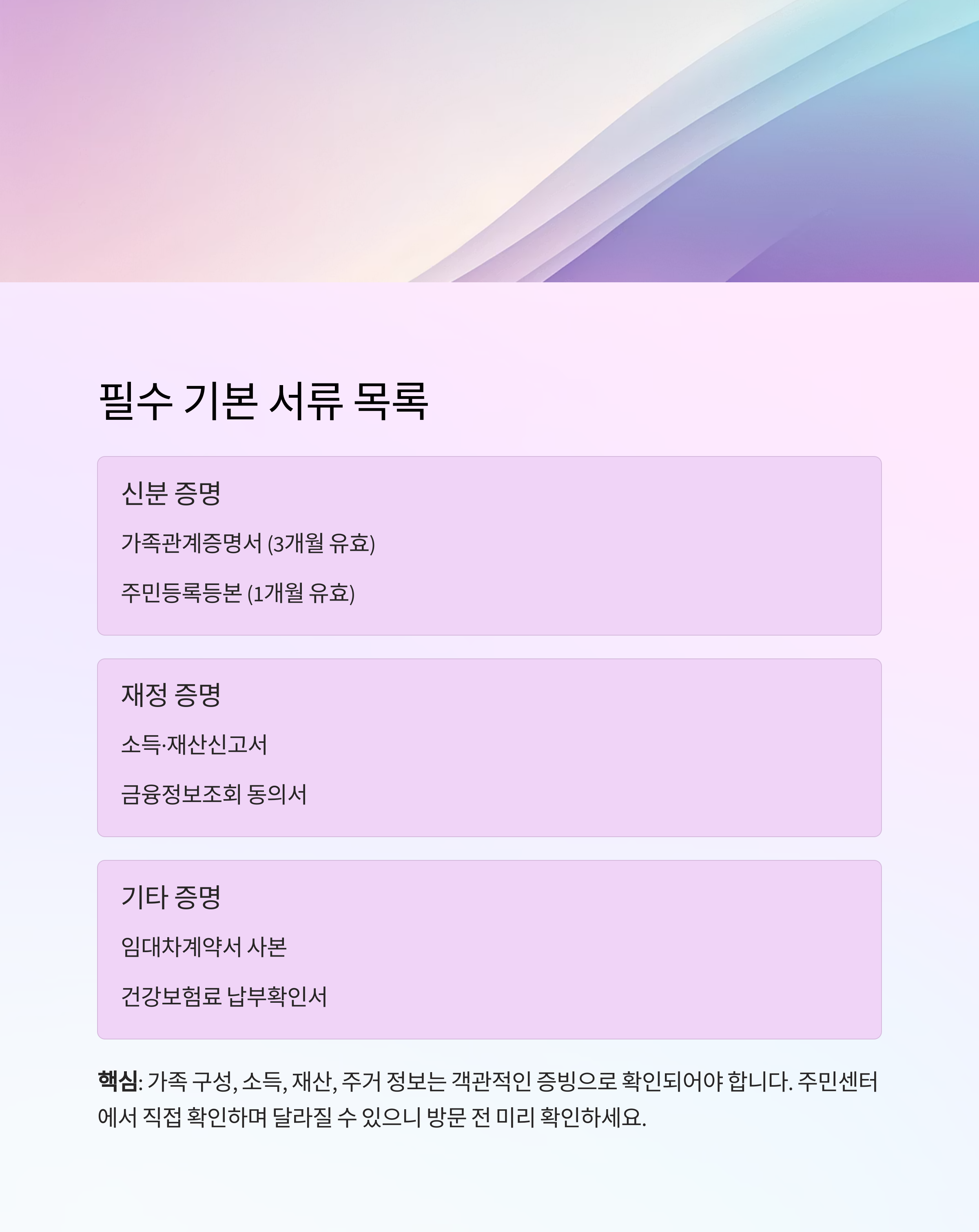 핵심: 가족 구성, 소득, 재산, 주거 정보는 객관적인 증빙으로 확인되어야 합니다.
