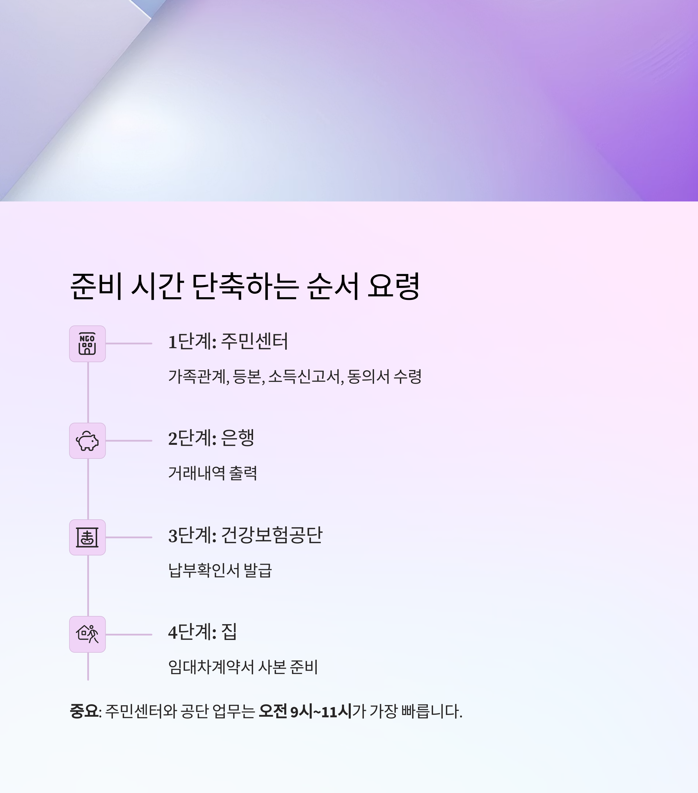 중요: 주민센터와 공단 업무는 오전 9시~11시가 가장 빠릅니다.