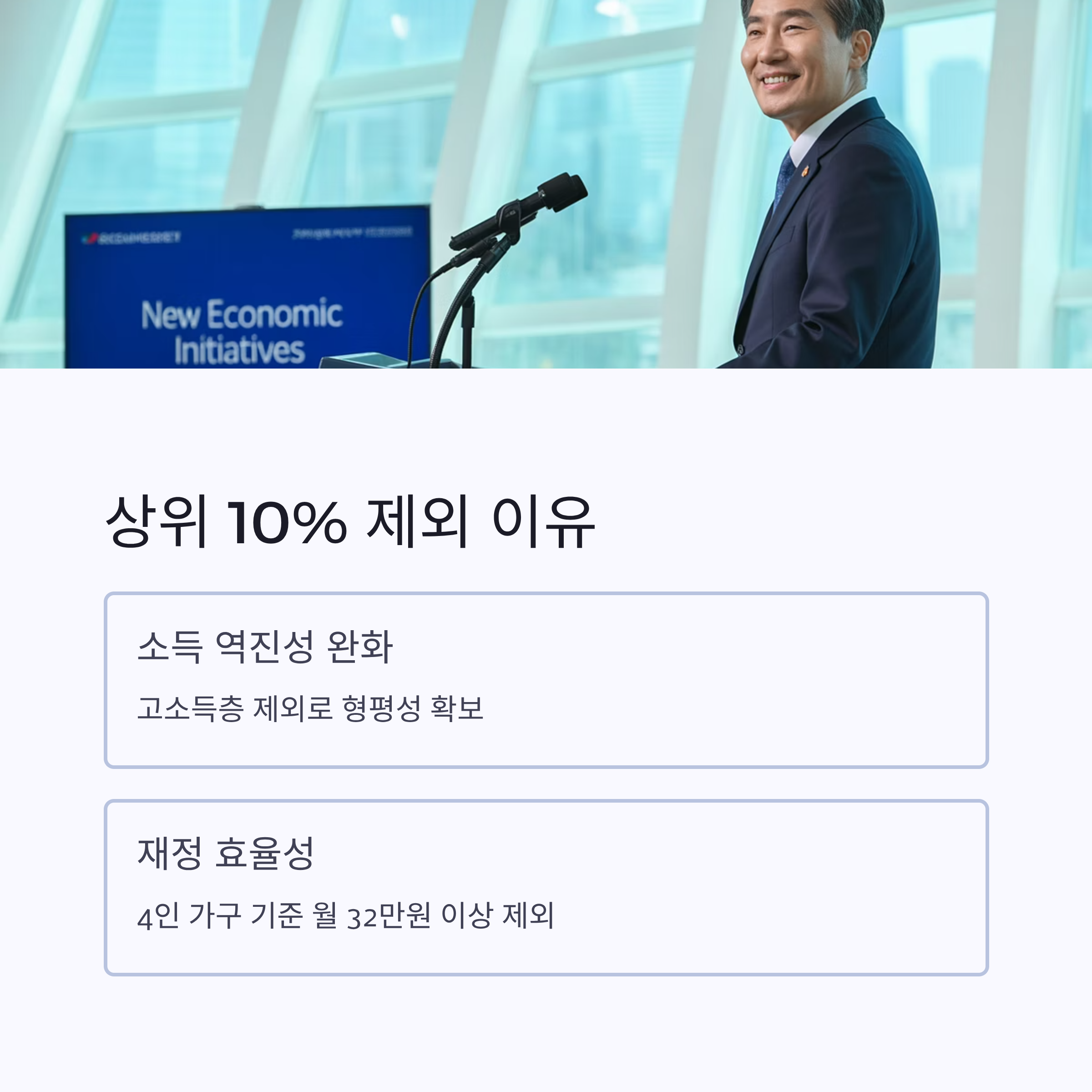 정부는 소득 역진성 완화 및 재정 효율성 확보를 위해 고소득층은 대상에서 제외하고 있어요.
