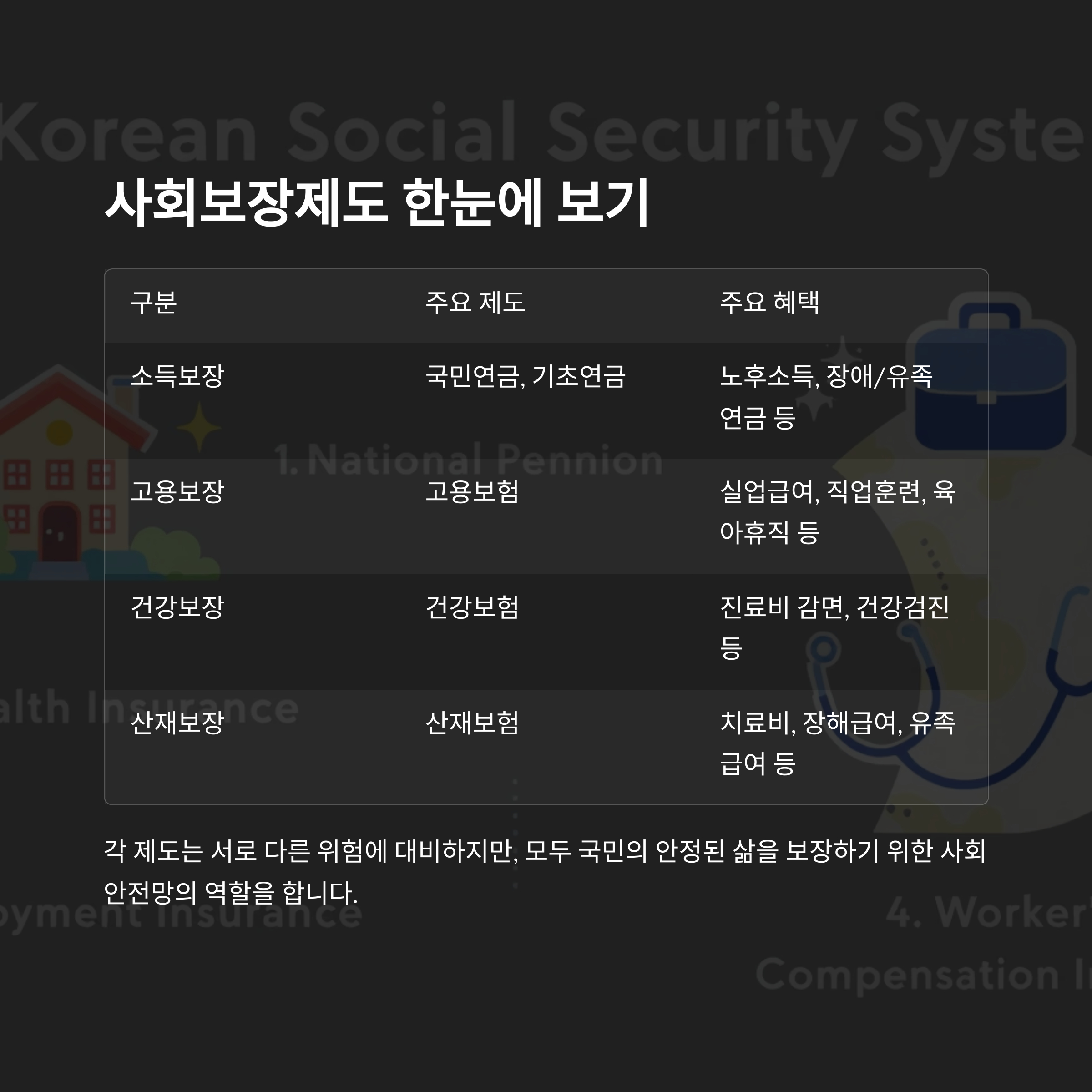복잡하고 어려운 사회보장제도, 막상 알아보려 하면 용어부터 벽에 부딪히는 경우가 많습니다. 이 글에서는 국민연금, 건강보험, 고용보험, 산재보험 등 우리가 일상에서 꼭 알아야 할 제도들을 알기 쉽게 설명드립니다. 제도별 특징과 가입 요건, 혜택 등을 체계적으로 정리해 드릴게요.