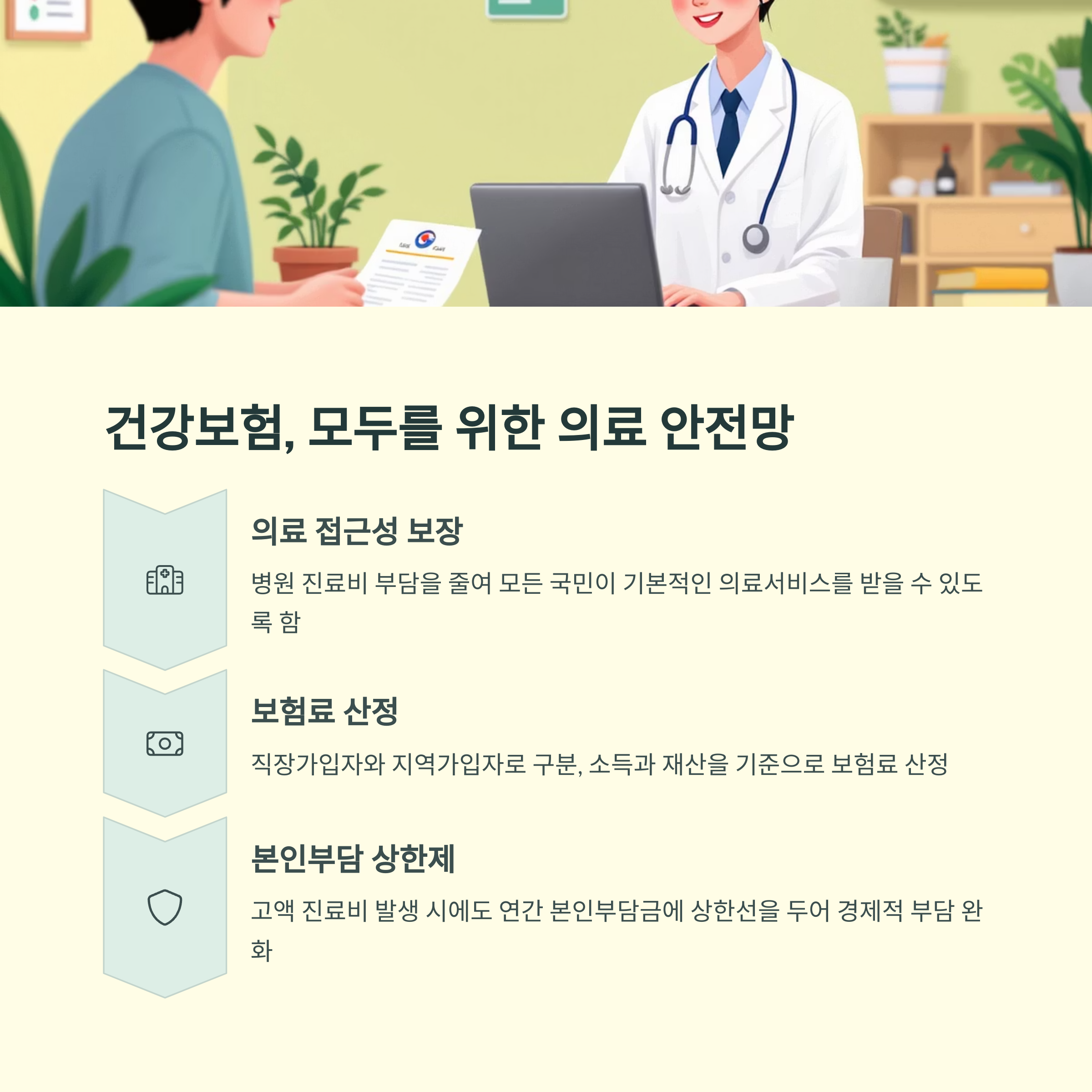 건강보험은 국민 모두가 최소한의 의료 혜택을 보장받기 위한 제도입니다.
