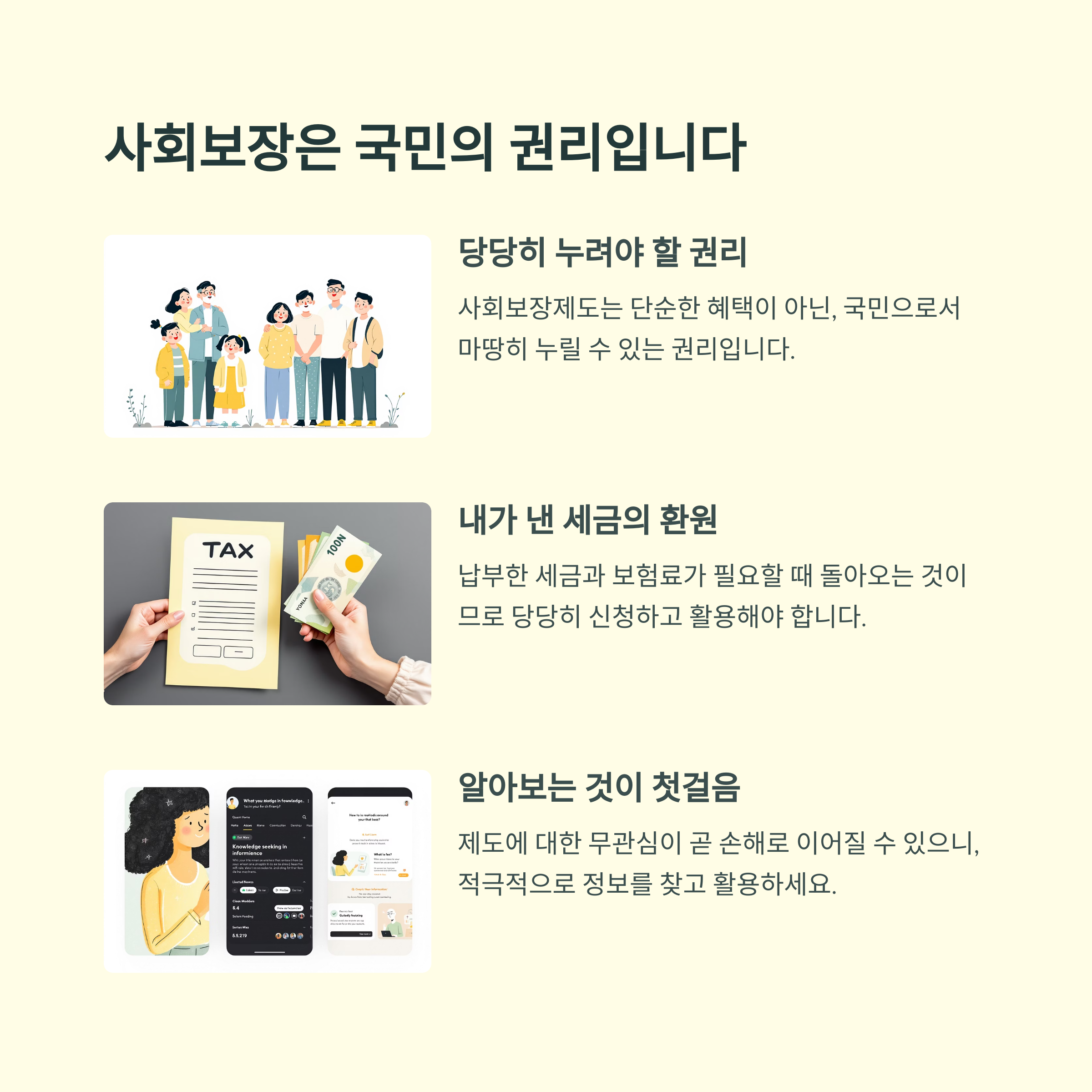 사회보장제도는 단순한 혜택이 아닌, 국민으로서 마땅히 누릴 수 있는 권리입니다.