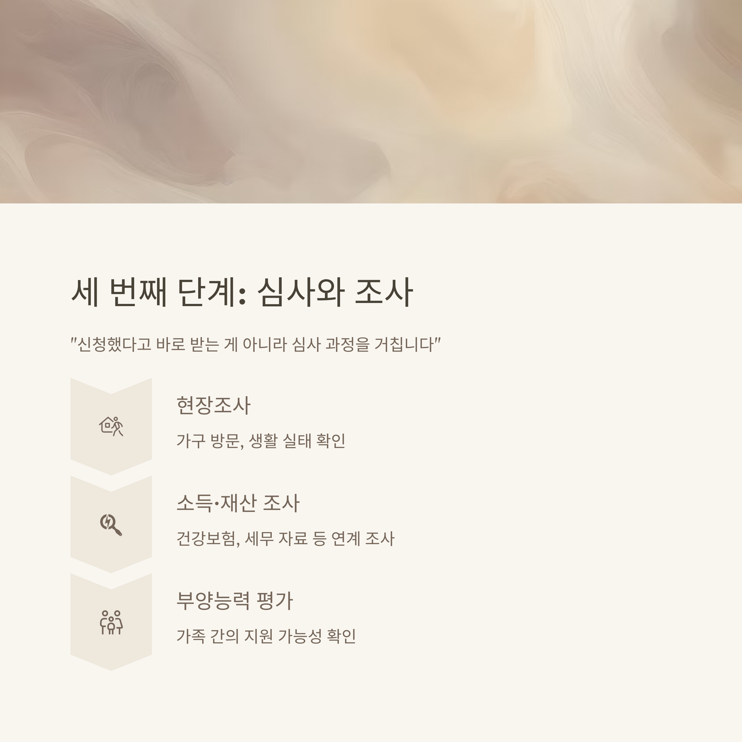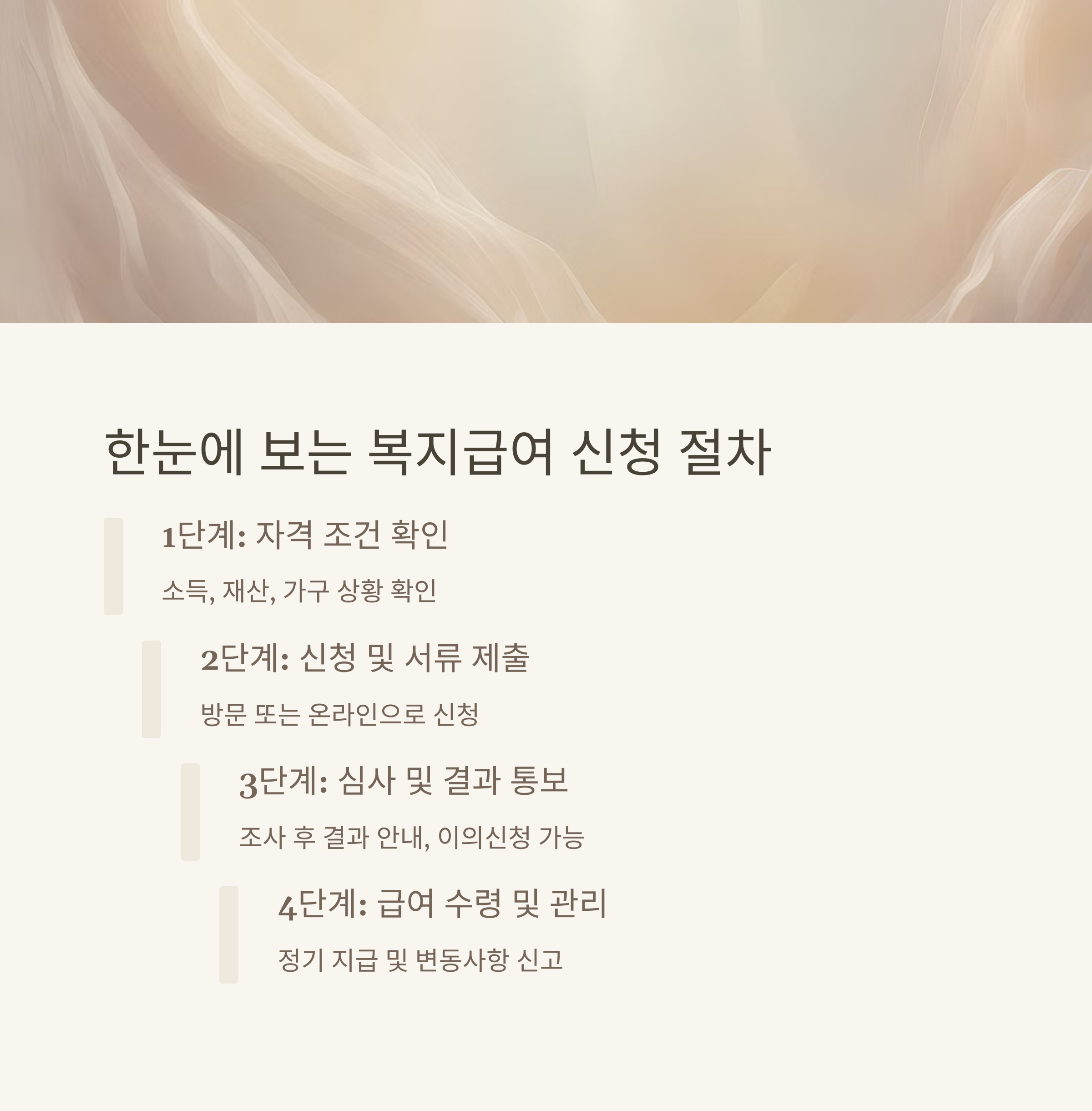 중요 요약: 복지 신청은 자격 확인 → 신청 → 심사 → 결과 통보 → 수급 시작의 순서입니다