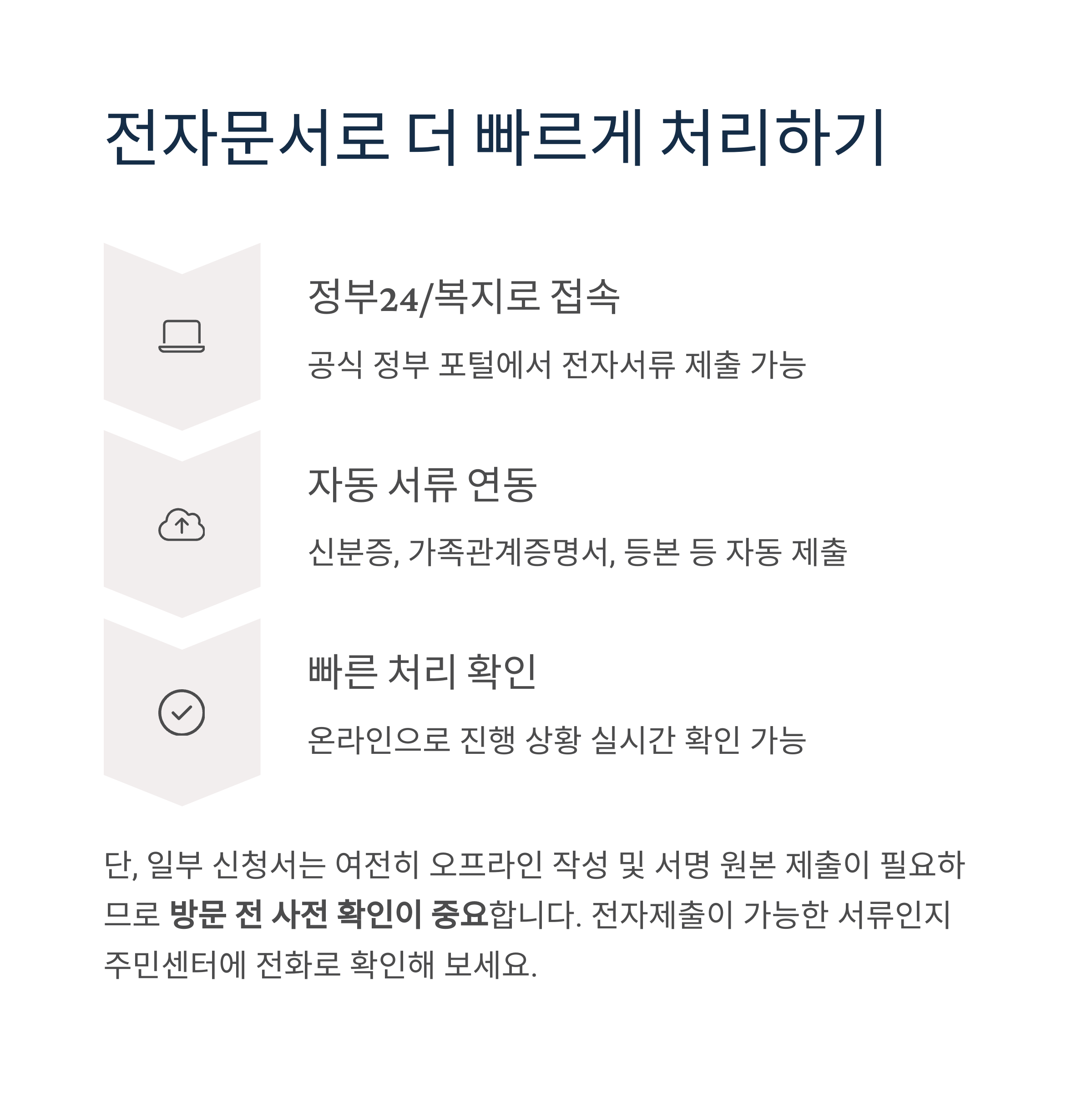 단, 일부 신청서는 여전히 오프라인 작성 및 서명 원본 제출이 필요하므로 방문 전 사전 확인이 중요합니다.