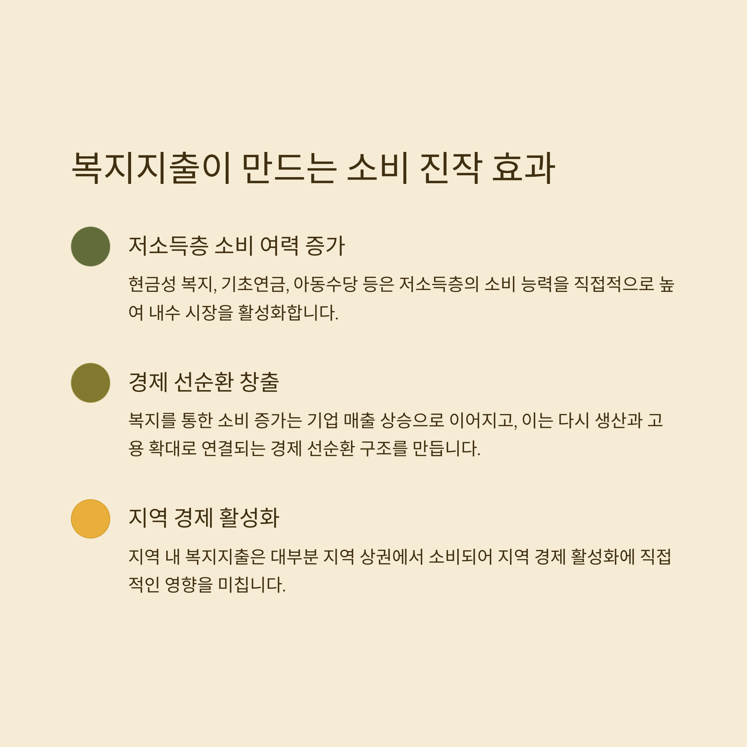 복지정책은 가계소득을 직접적으로 보전해 주는 수단이 되며, 이는 저소득층의 소비 여력을 높이는 결과로 이어집니다. 특히 현금성 복지, 기초연금, 아동수당 등의 확대는 즉각적인 소비로 이어지며 내수 진작 효과를 불러옵니다. 소비가 늘면 기업 매출이 증가하고, 이는 생산과 고용 확대까지 연결될 수 있습니다.