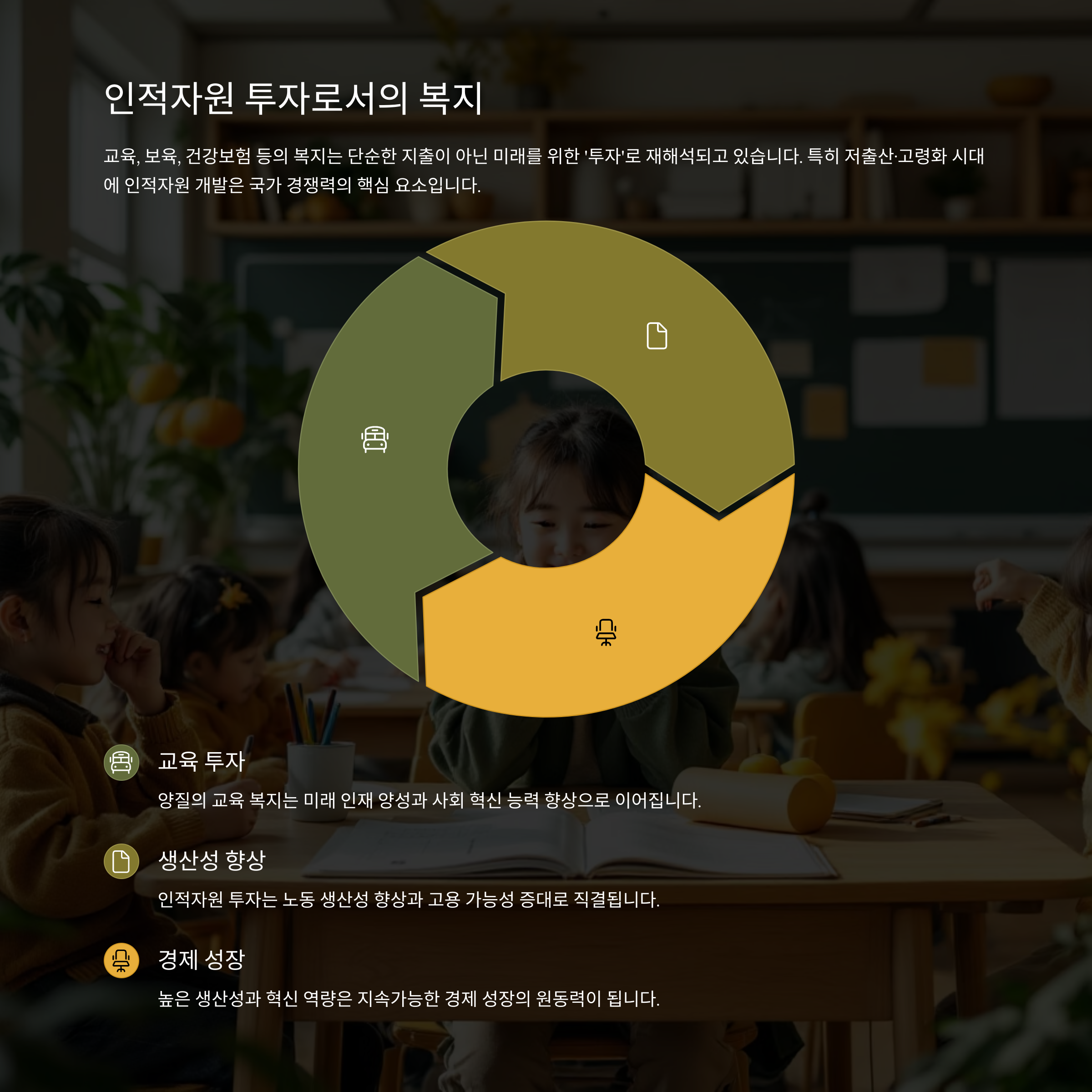 교육, 보육, 건강보험 등의 복지는 단순 지출이 아닌 '투자'로 보는 시각이 증가하고 있습니다. 이는 장기적으로 고용가능성과 노동 생산성을 높이는 효과로 이어져 국가 경쟁력을 강화시키는 데 기여합니다. 특히 저출산·고령화 시대에 ‘가치 있는 복지 투자’로 주목받고 있습니다.