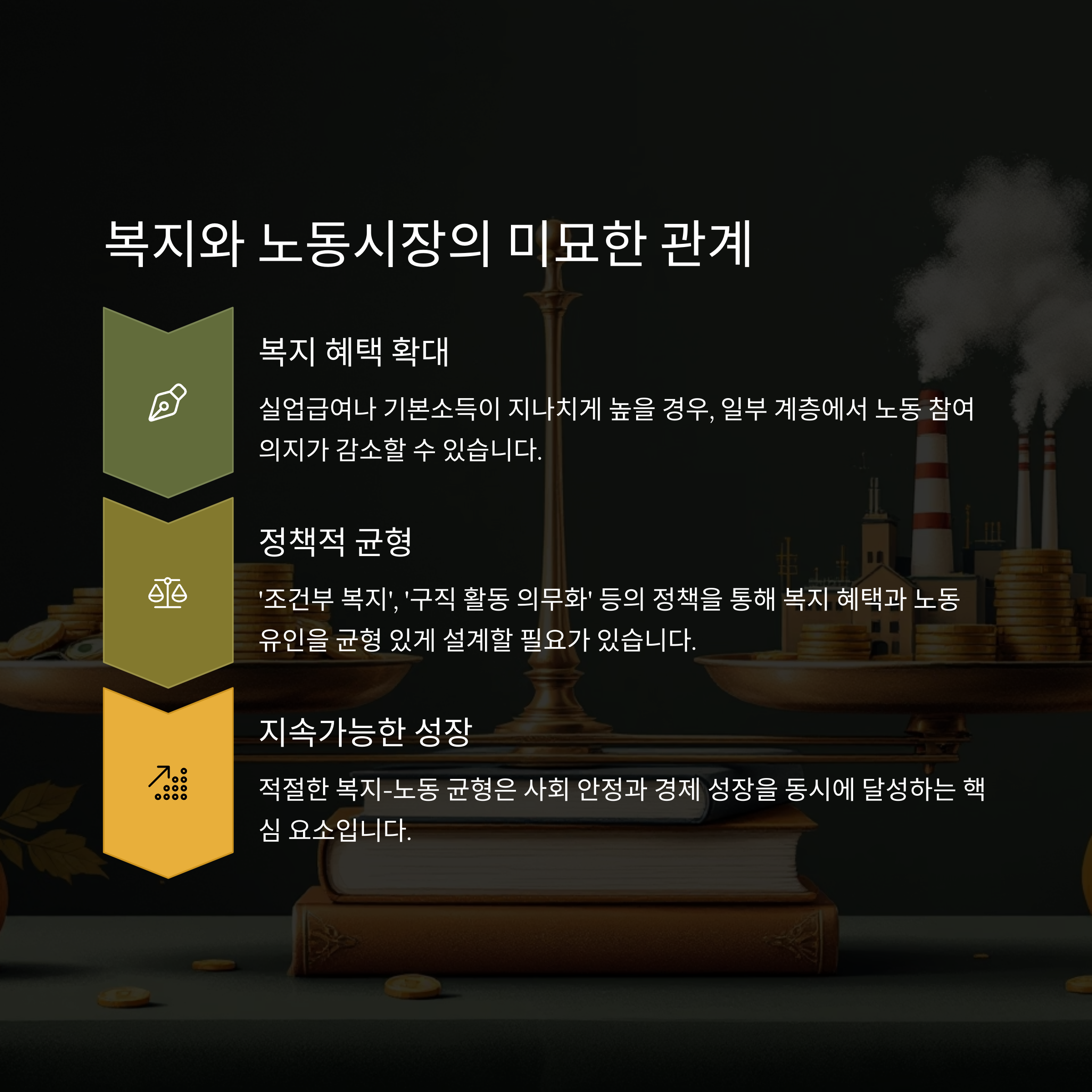복지정책이 과도하게 설계되면 ‘근로 유인’이 약화될 수 있다는 지적도 있습니다. 특히 실업급여나 기본소득이 충분히 높을 경우, 일부 계층에선 노동 참여 의지가 낮아질 가능성도 있습니다. 이에 따라 많은 국가들은 '조건부 복지', '구직 활동 의무화' 등의 정책을 병행하고 있습니다.