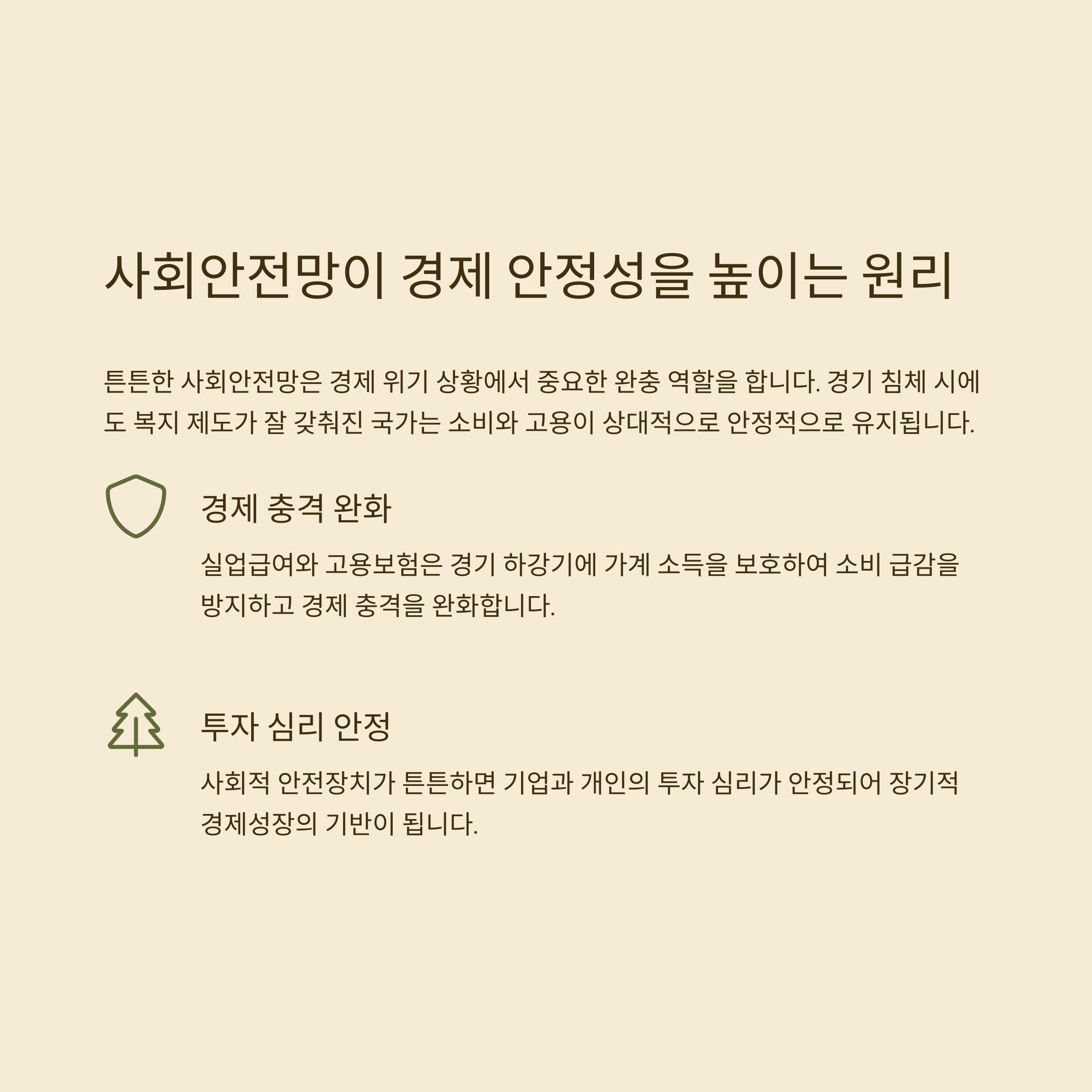 복지정책이 튼튼하게 작동하는 국가는 경기침체 시에도 상대적으로 소비와 고용이 빠르게 회복됩니다. 이로 인해 기업이나 개인의 투자 심리 역시 안정적으로 유지되며, 장기적으로 경제성장의 기초 체력을 높이는 역할을 합니다. 특히 실업급여나 고용보험은 경기 하강기에 큰 버팀목이 됩니다.
