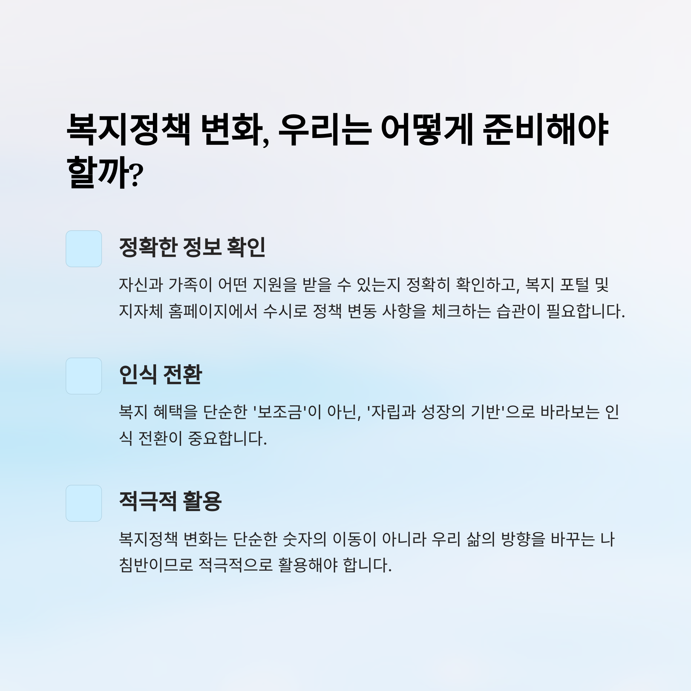 이러한 변화는 단순한 행정조치가 아니라 우리 삶 깊숙한 곳까지 영향을 미칩니다. 이 글에서는 복지정책 변화가 실제 일상에 미치는 주요 영향들을 분석하고, 앞으로 우리가 어떻게 준비해야 할지 안내해 드립니다.