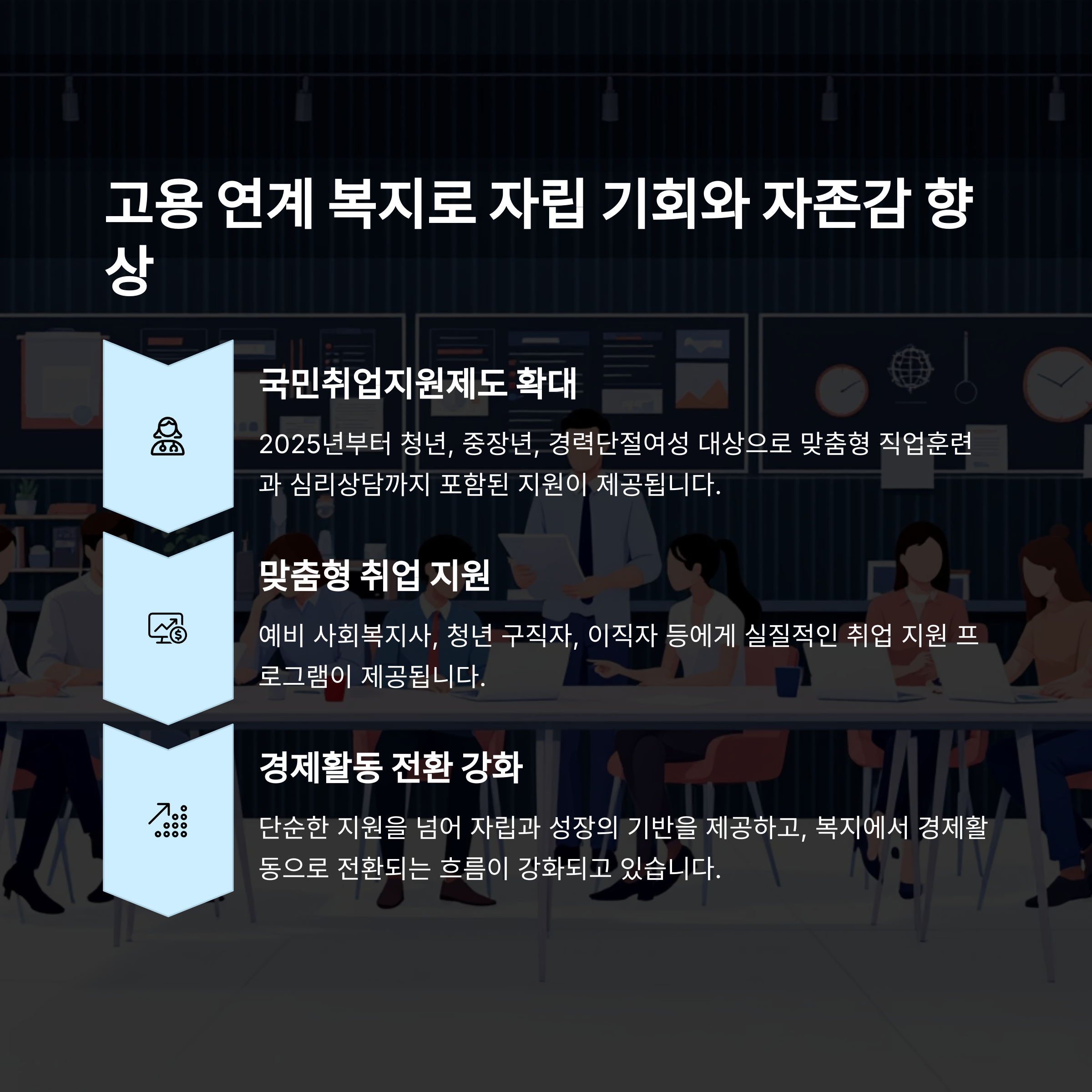복지수급자에게 일자리 연계가 제공되는 정책이 확대되고 있습니다.