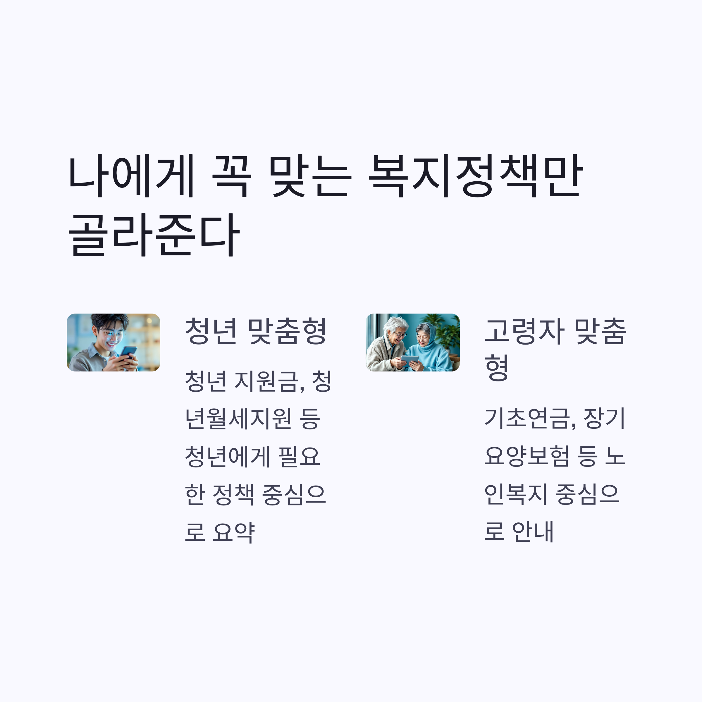 | 고령자 | 기초연금, 장기요양보험 등 복지 중심 안내 |