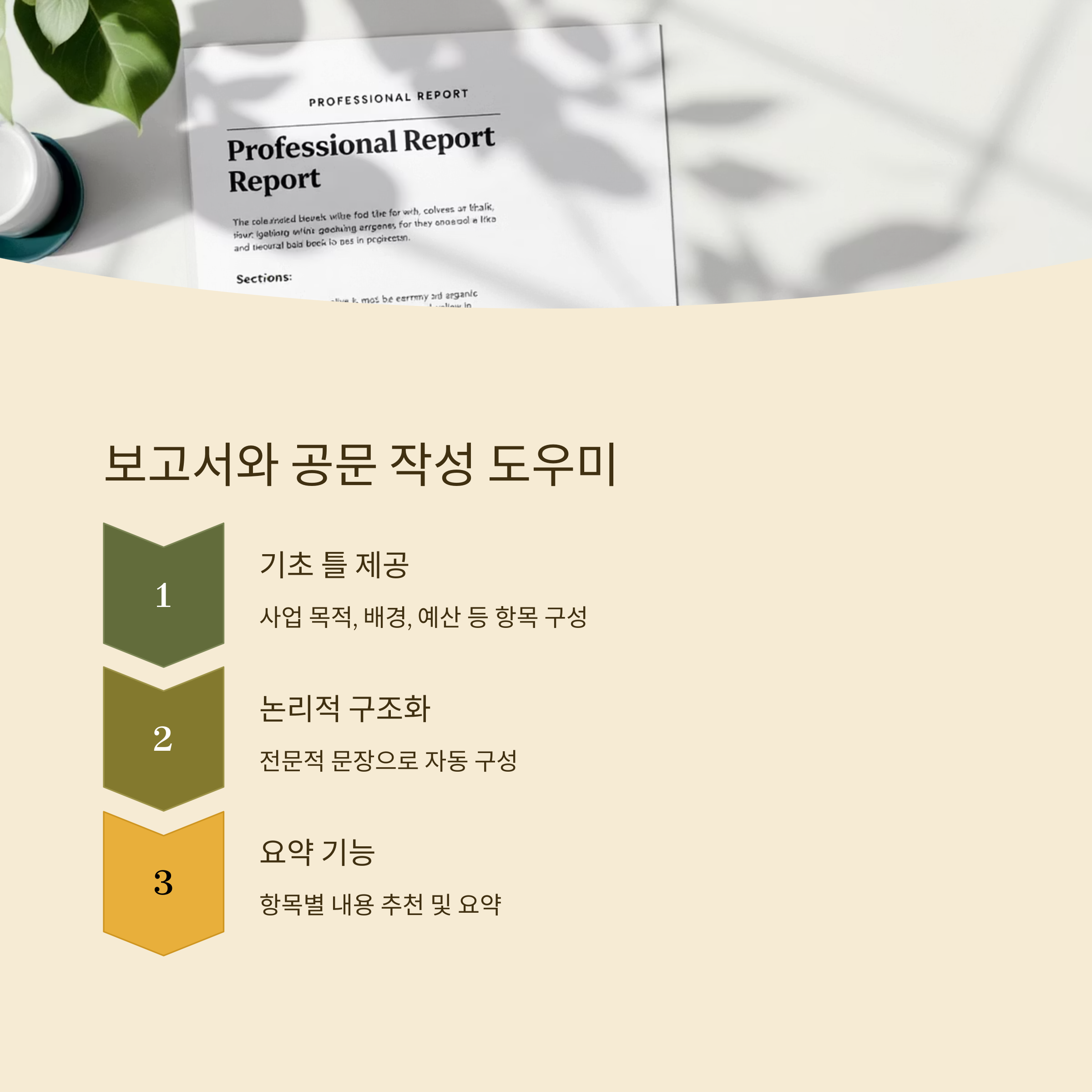 | Q3 | 보고서/계획서 작성 | 문서 구조 제공, 항목별 자동 구성 |