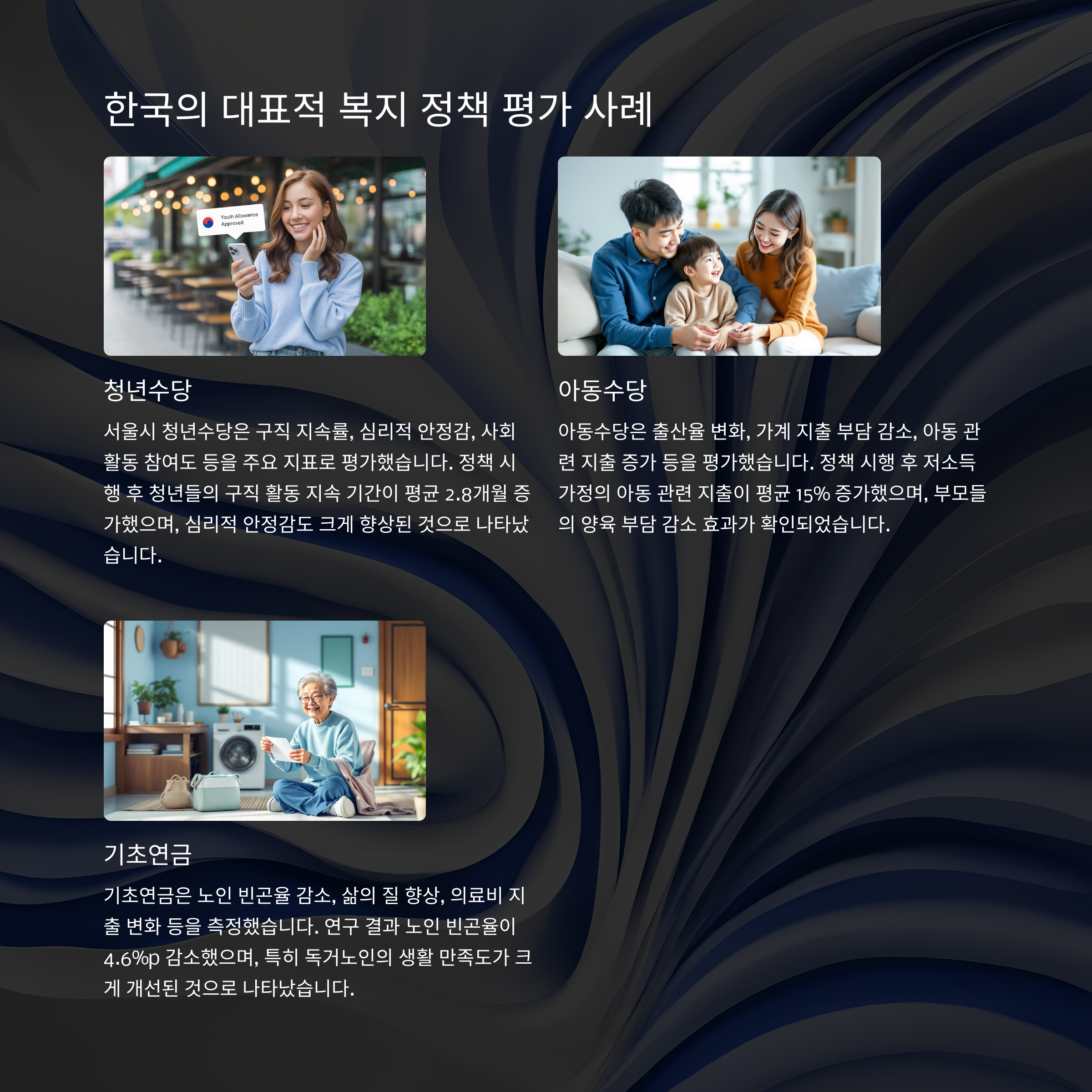 아동 수당의 경우 출산율, 아동 빈곤율, 가계 지출 감소 등 다양한 측면을 살펴야 합니다.