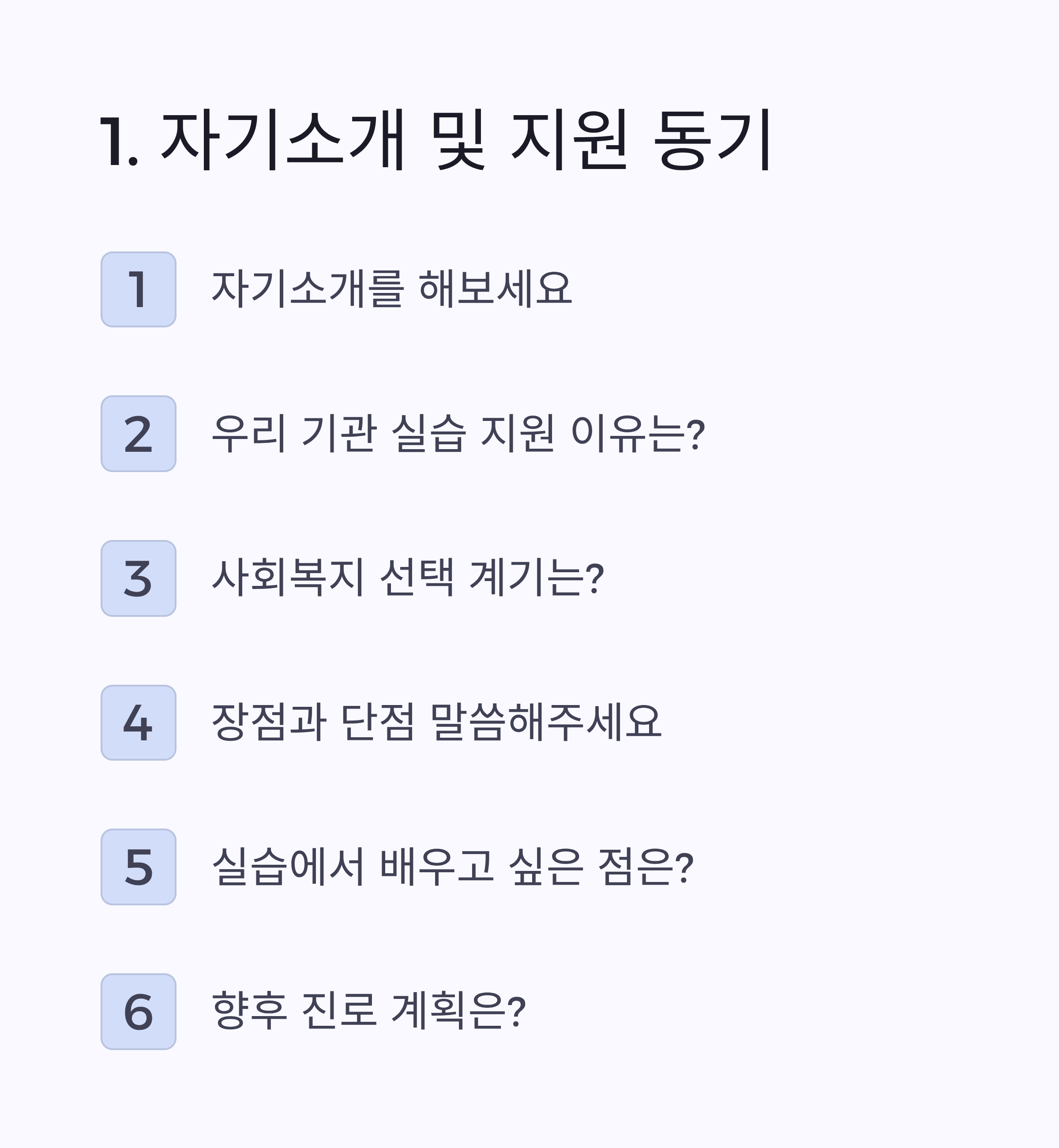 아래는 사회복지·아동센터 실습에서 자주 나오는 면접 질문 50선과 답변을 짜는 기본 프레임입니다.