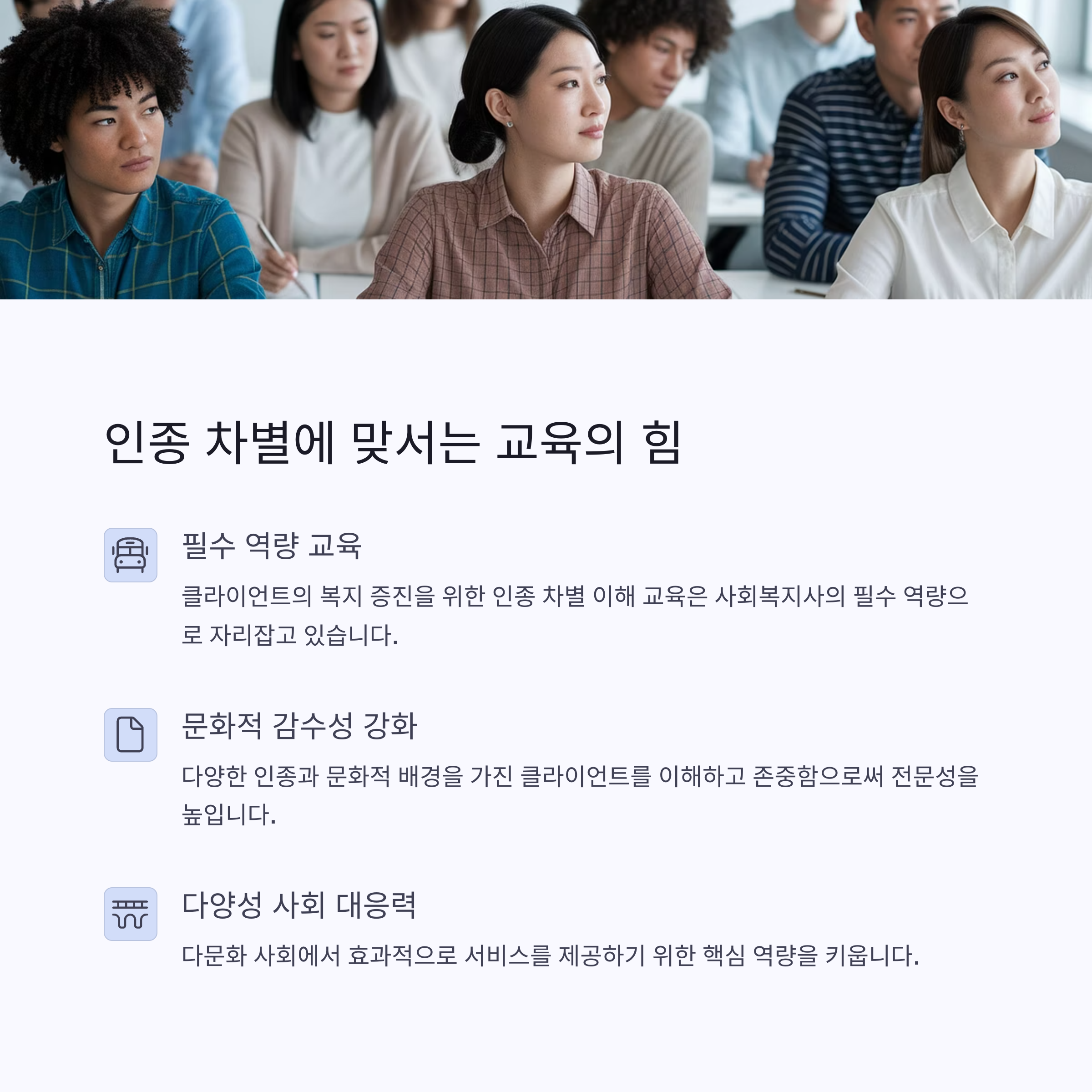 | 다양성은 우리 사회의 건강한 정책 수립을 위한 필수 요소입니다. 사회복지사는 모든 사람의 평등을 보장하며 누구나 차별받지 않도록 돕습니다. 문화적 이해와 형평성을 강조하여, 갈등 해소 및 사회통합에 기여합니다. 포용적 복지 서비스는 소수자나 취약계층을 보호하는 데 중요합니다. 다양성 실천은 지역사회의 지속 가능성을 높이는 데 기여하는 핵심 요소입니다. |
