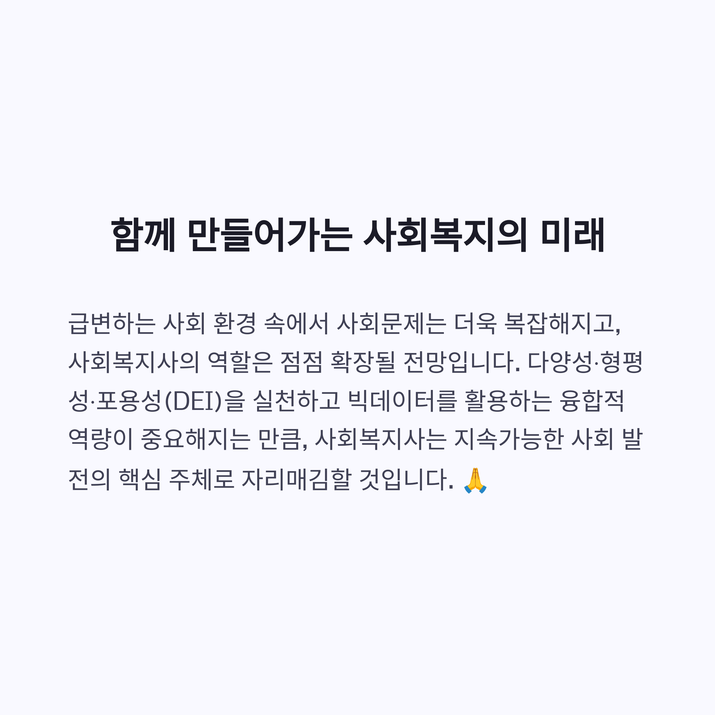지속적인 교육과 적극적 투자로 사회복지의 가치를 확장해 나가야 합니다.