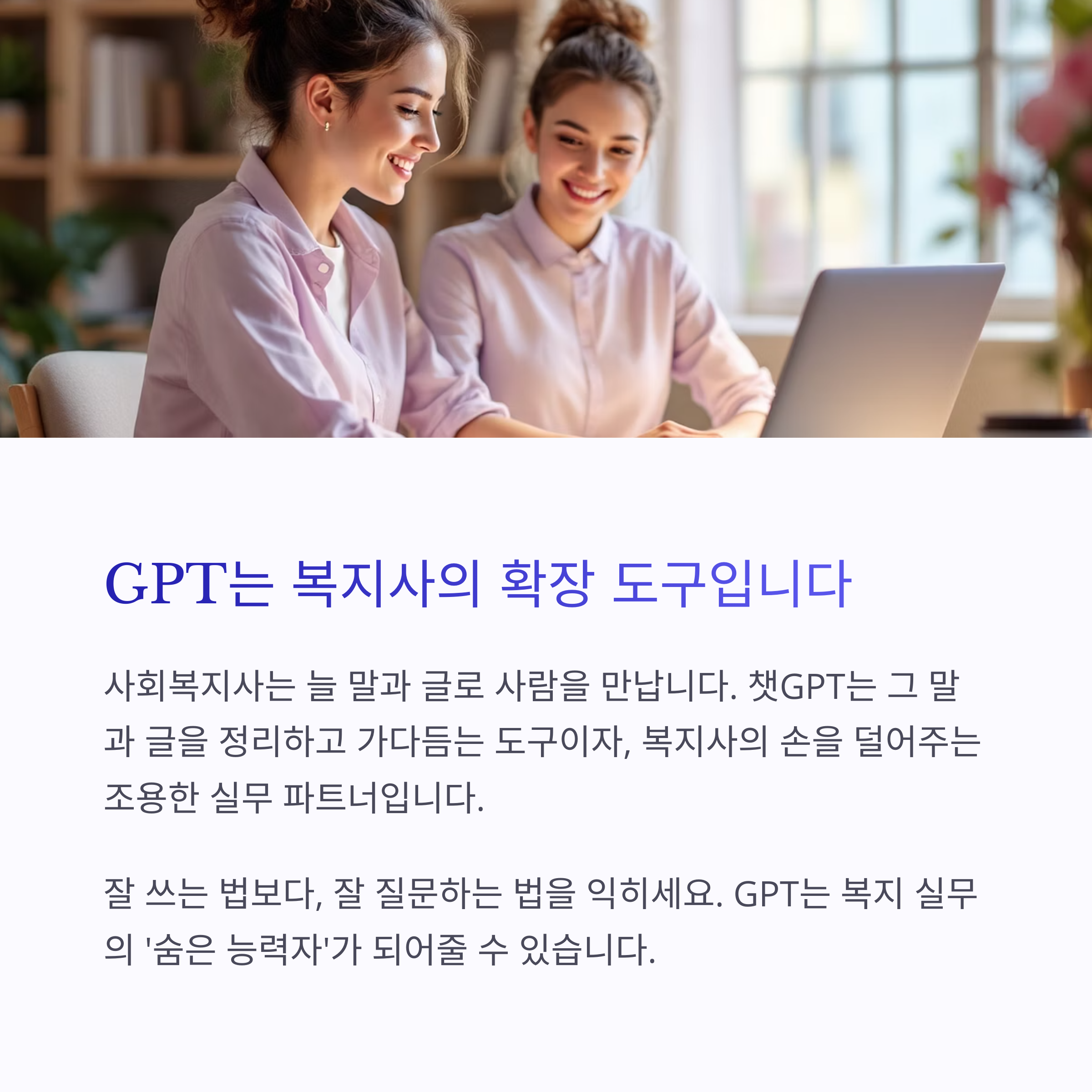 지금부터 GPT를 ‘질문만 잘하면 뭐든 해내는 복지 도우미’로 바꾸는 노하우를 확인하세요.