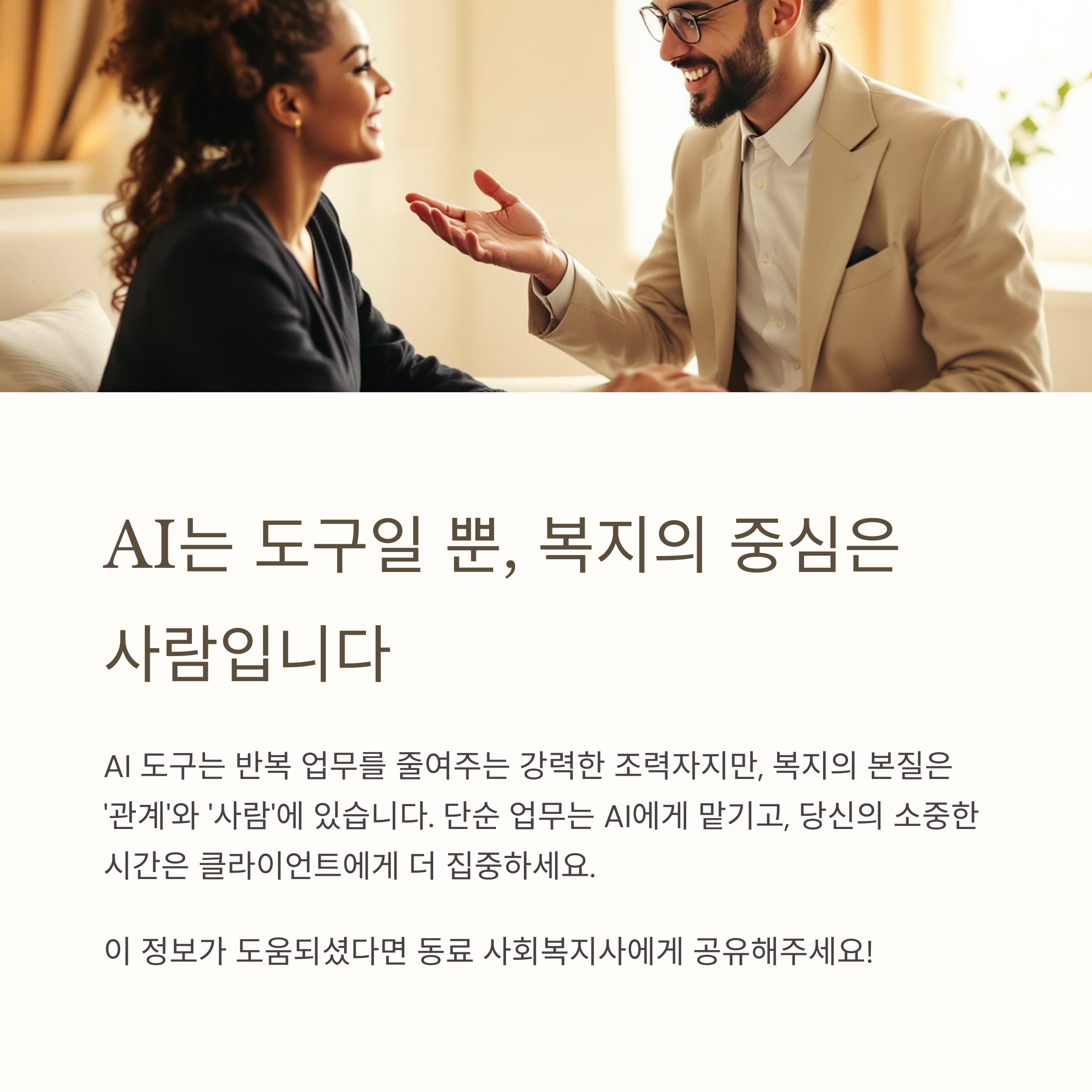 AI 툴은 사회복지사의 손발을 덜어주는 강력한 도우미입니다.