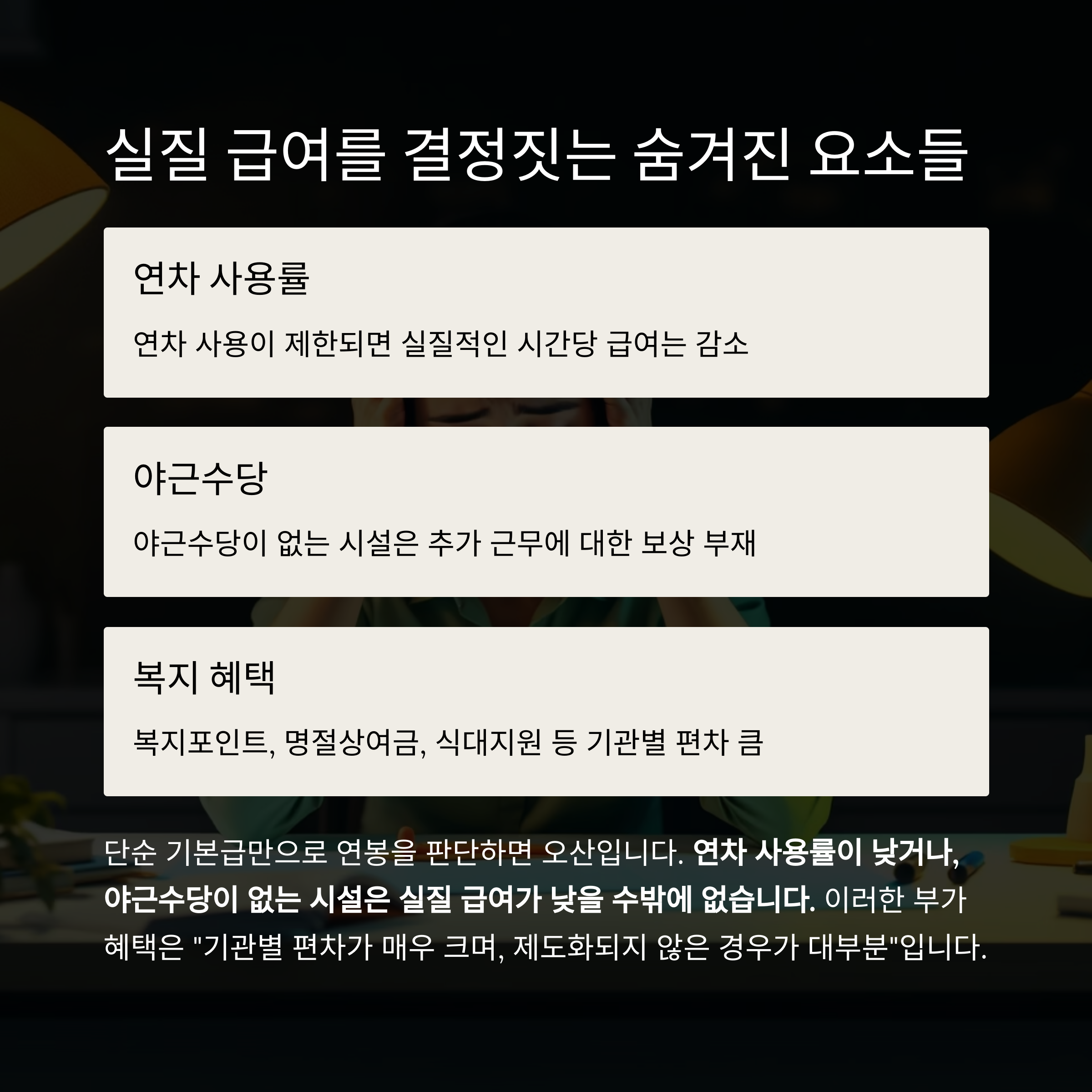 연차 사용률이 낮거나, 야근수당이 없는 시설은 실질 급여가 낮을 수밖에 없습니다.