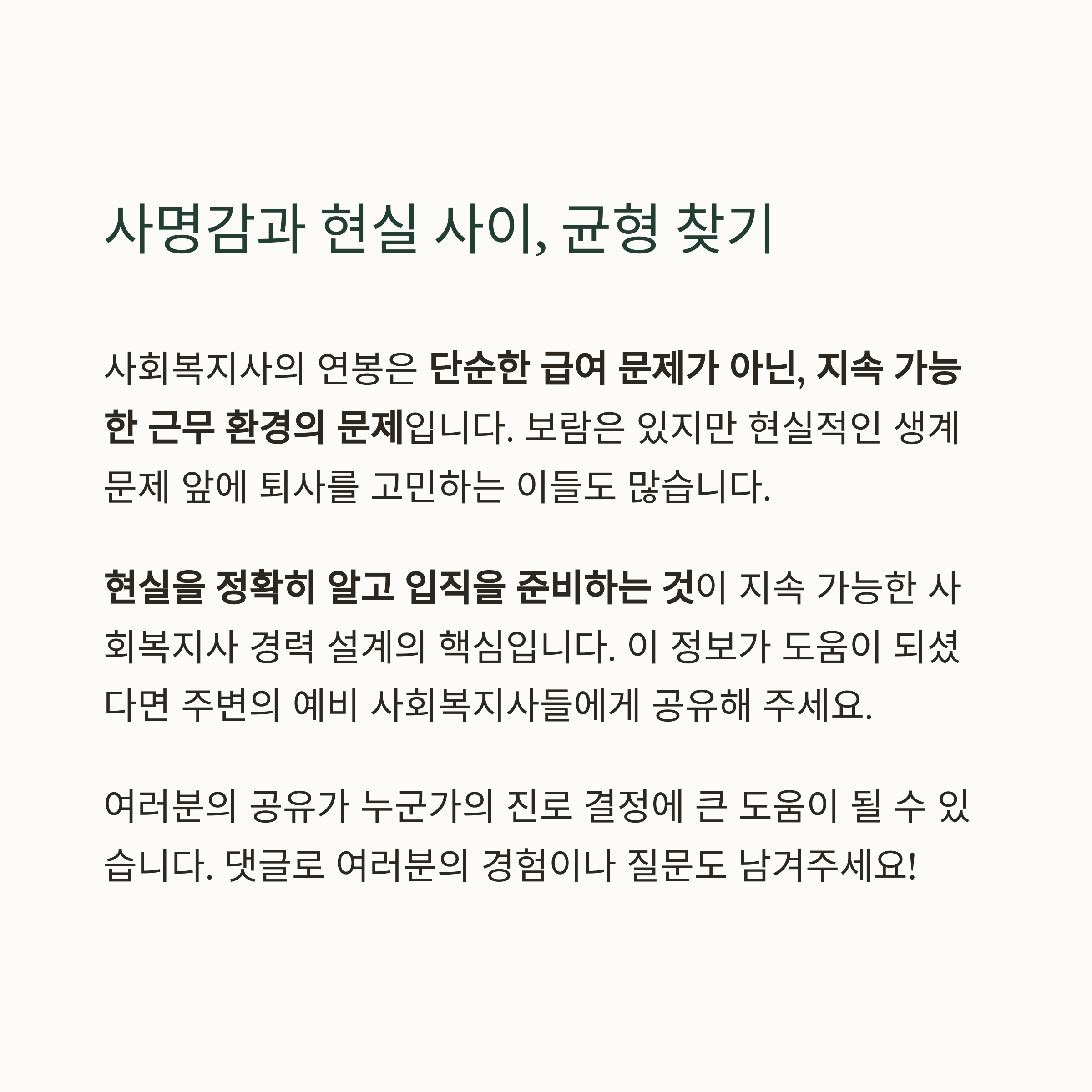 사회복지사의 연봉은 단순한 급여 문제가 아닌, 지속 가능한 근무 환경의 문제입니다.