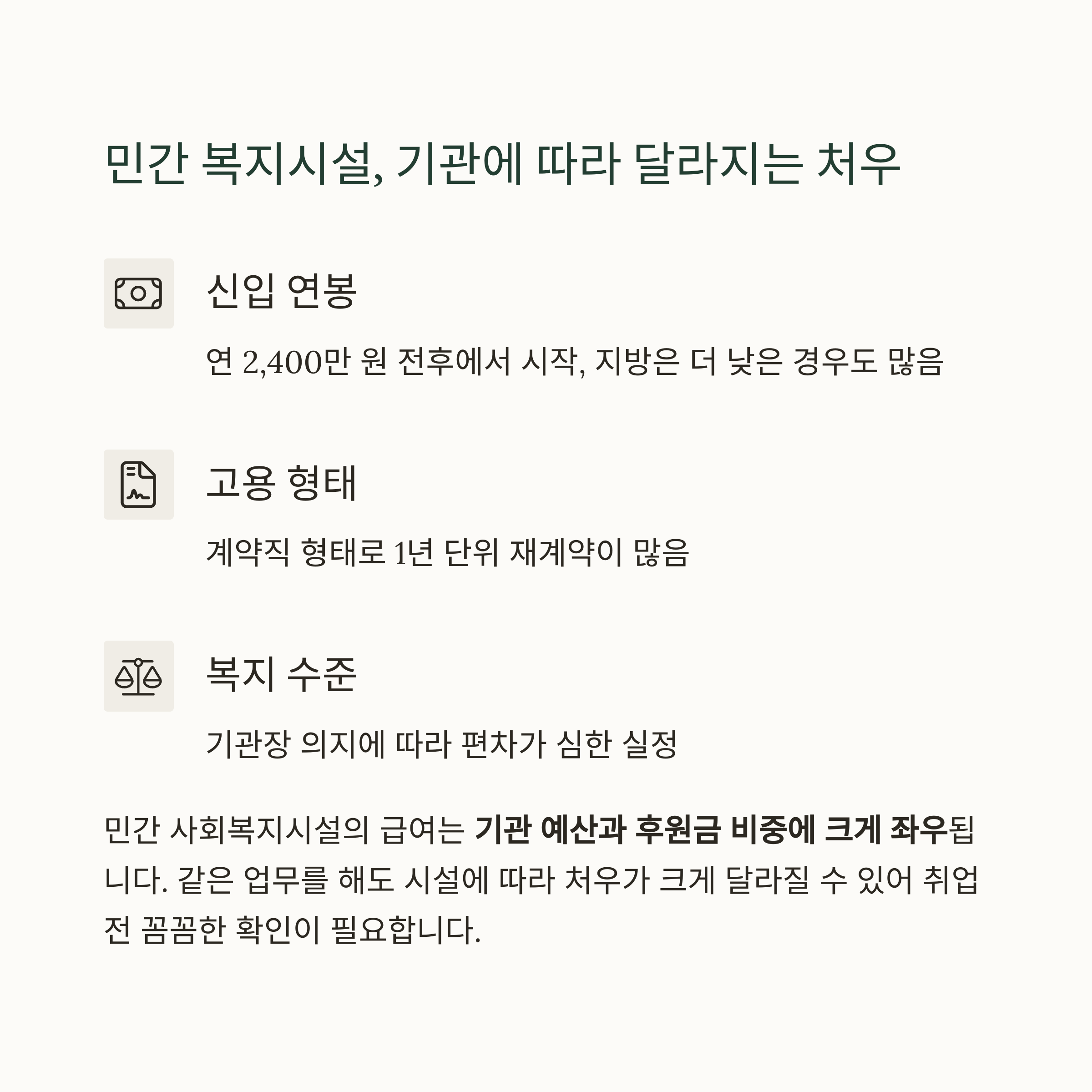 민간 사회복지시설의 급여는 기관 예산과 후원금 비중에 크게 좌우됩니다.