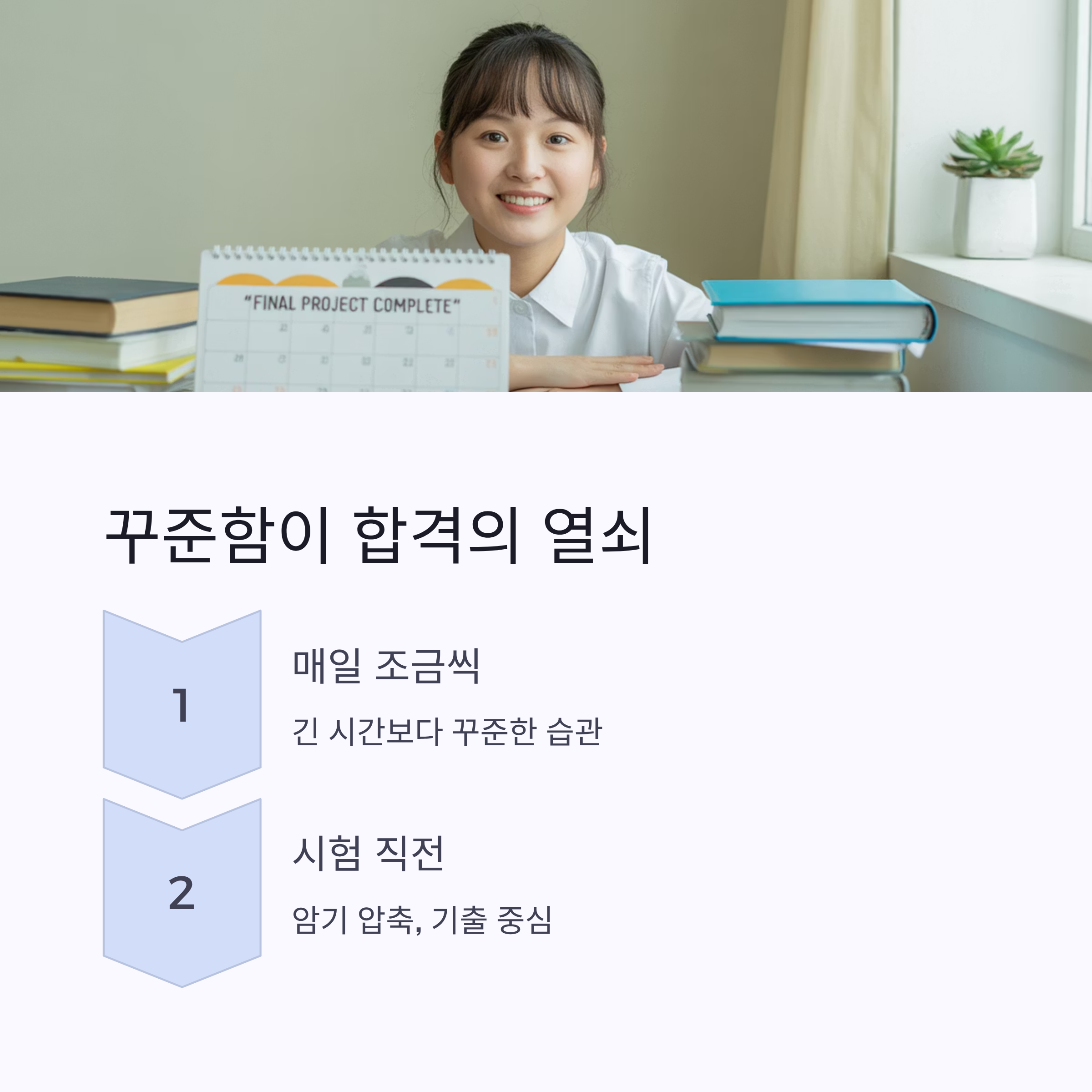중요한 건 긴 시간 몰아 공부하는 것보다 매일 조금씩이라도 꾸준히 이어가는 습관이에요. 특히 시험 직전에는 암기 과목을 압축 복습하고, 실천 과목은 기출문제 위주로 정리하는 게 합격에 큰 도움이 돼요.