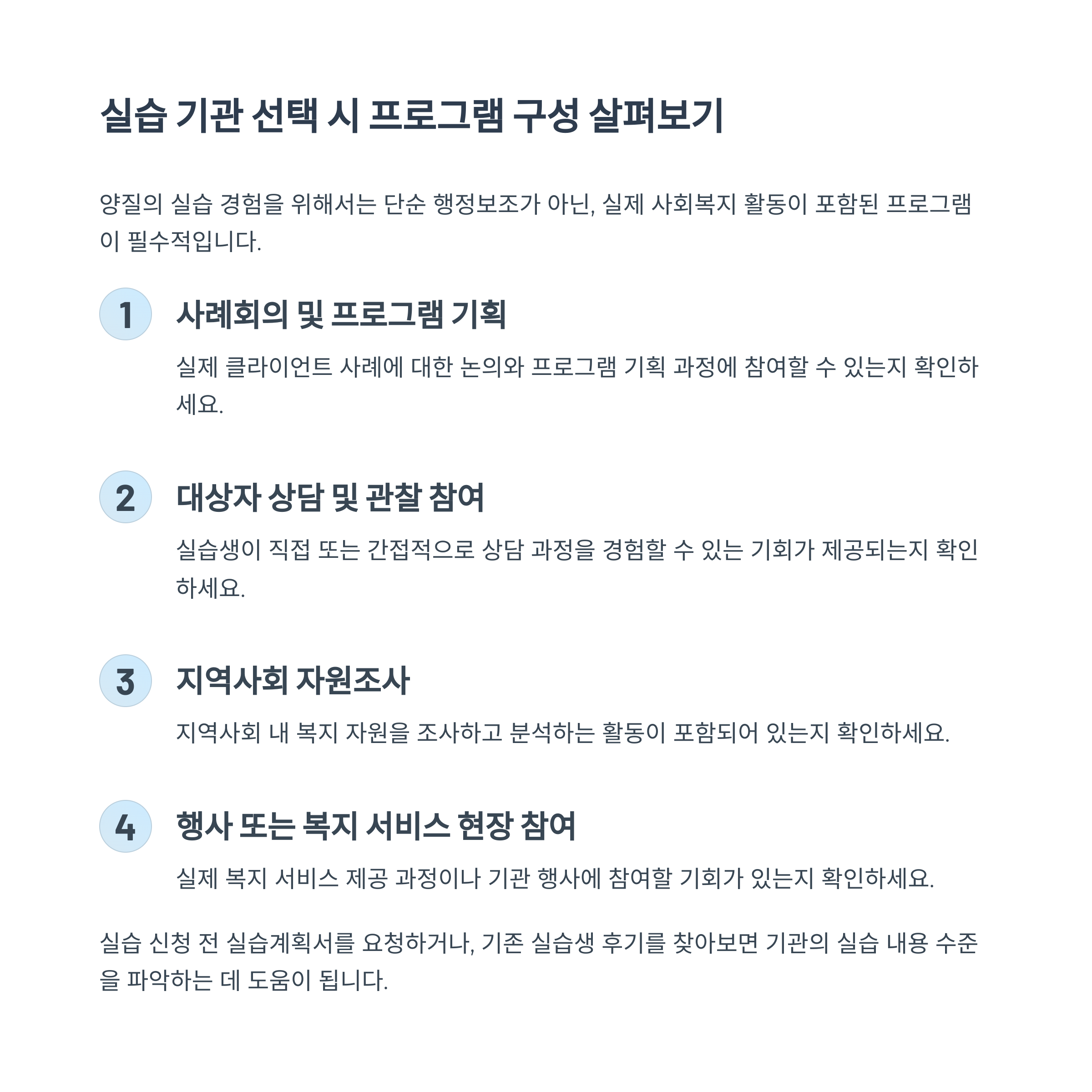 단순 행정보조가 아닌, 실제 사회복지 활동이 포함된 프로그램이 중요합니다.