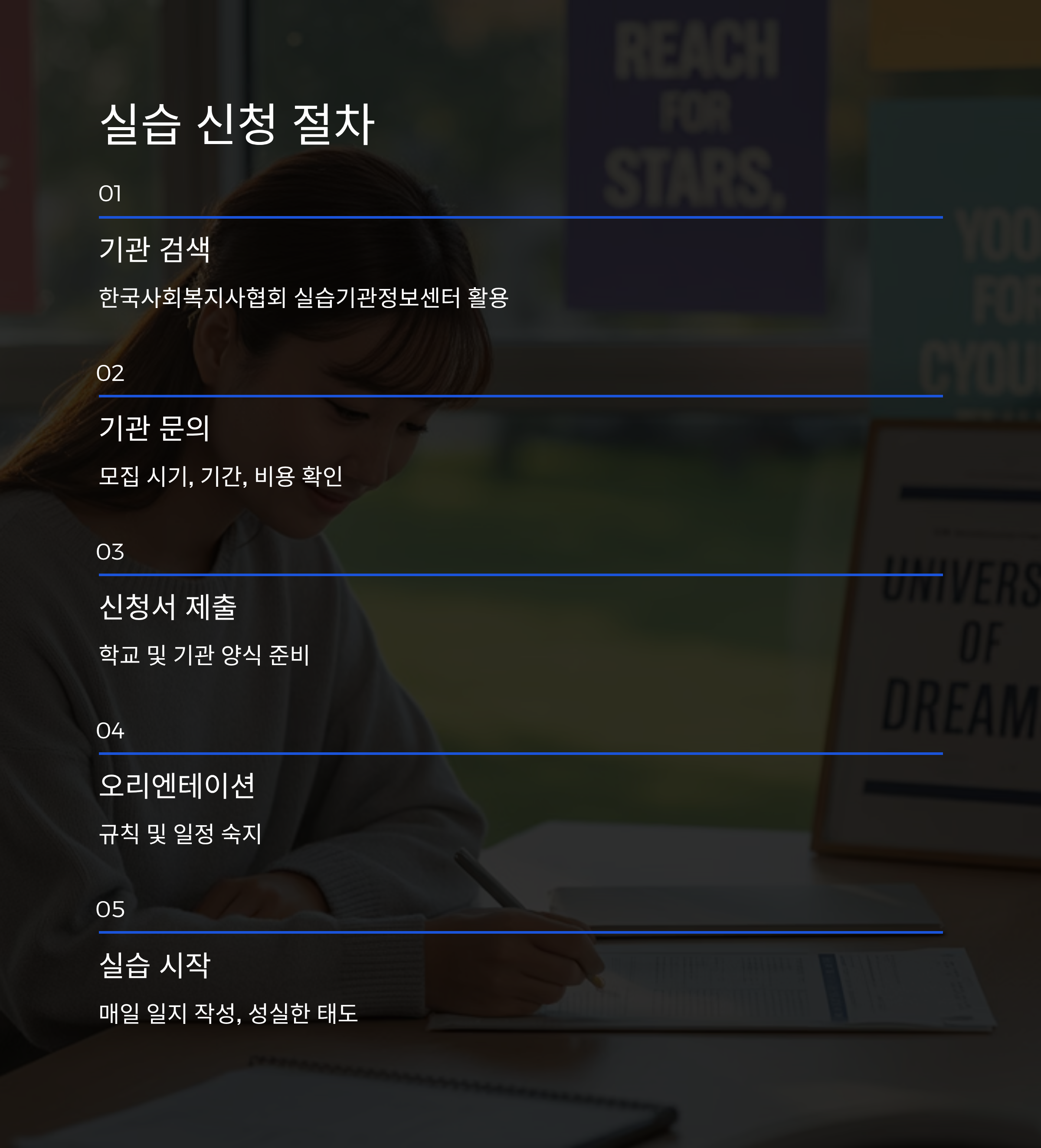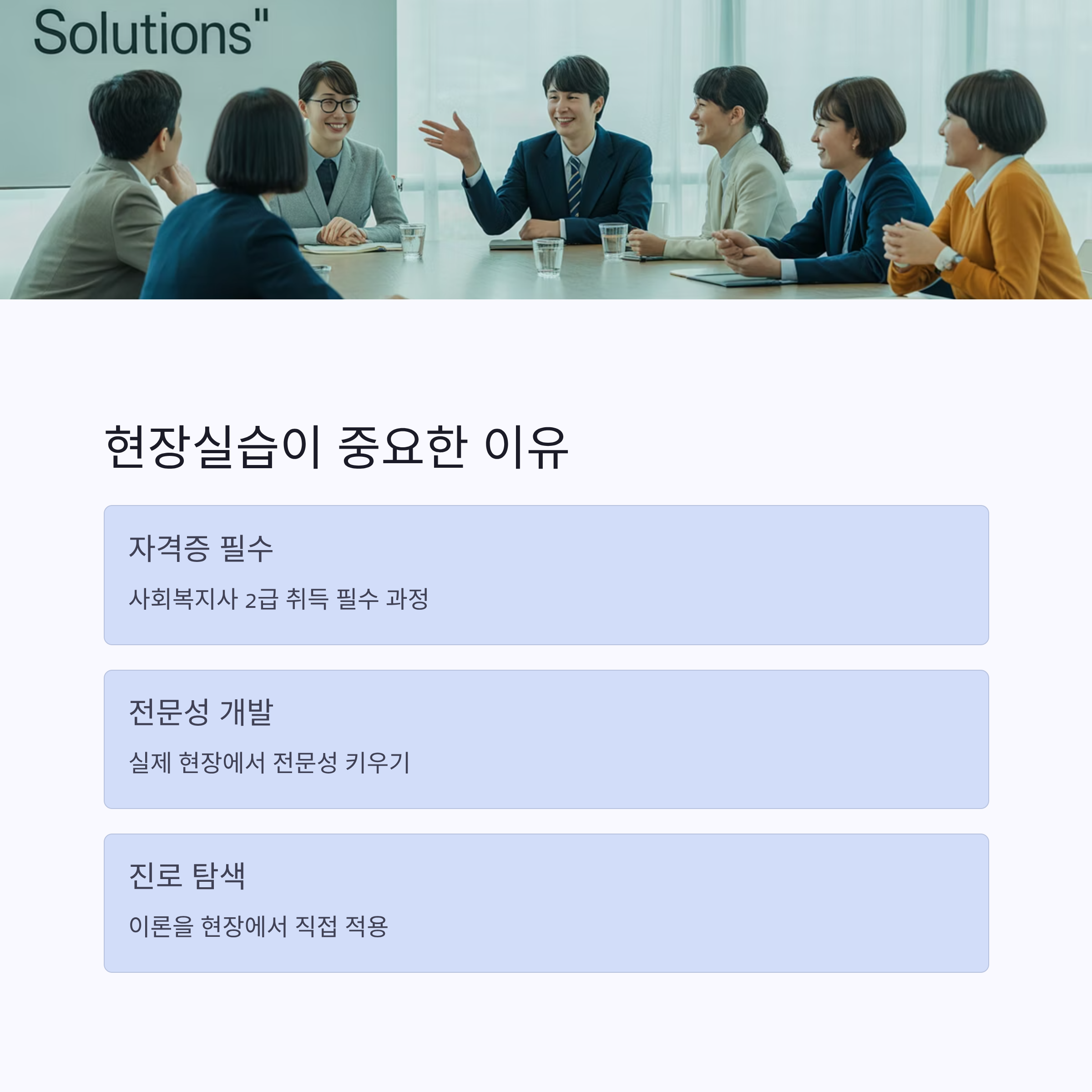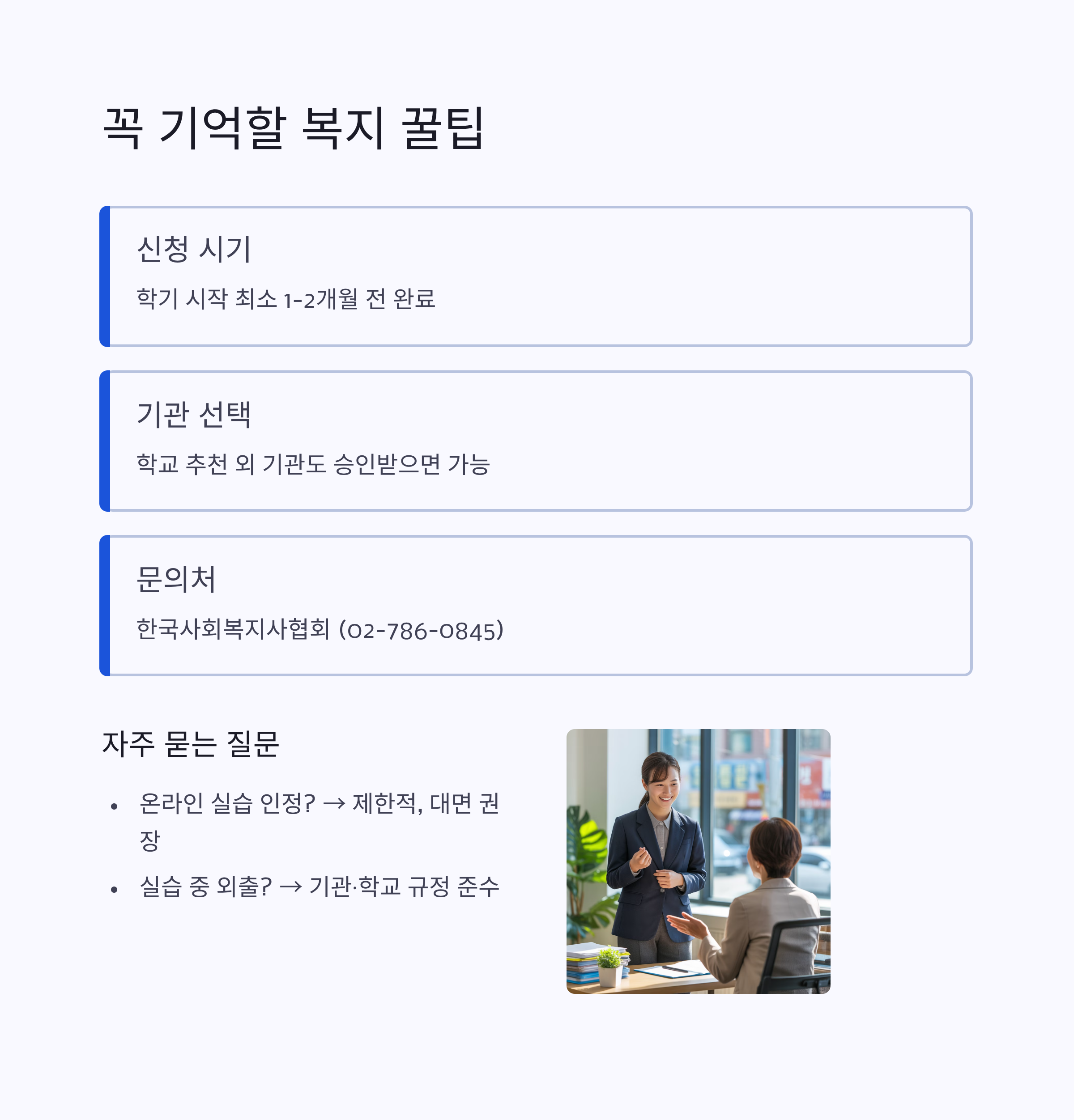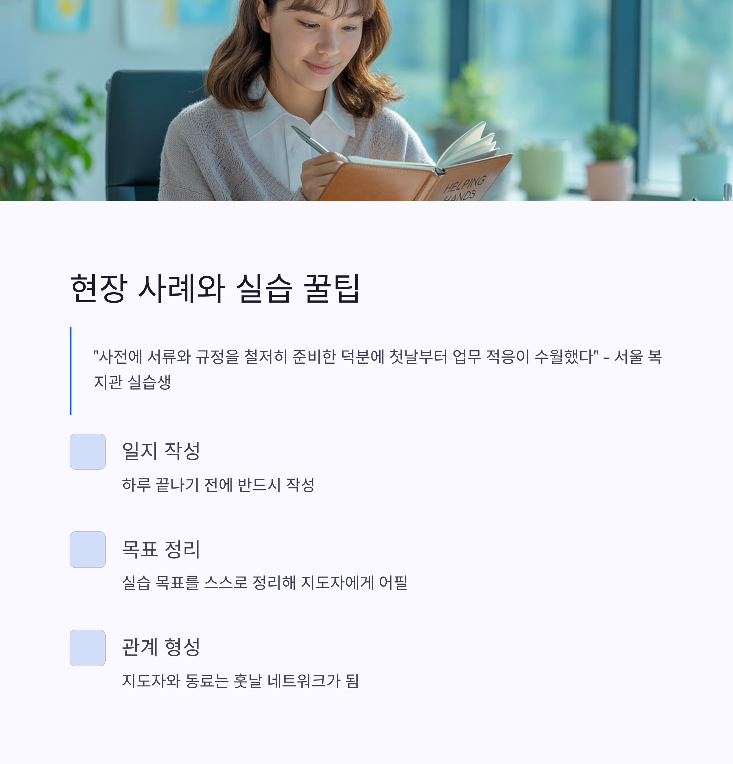 서울의 한 복지관에서 실습한 학생은 “사전에 서류와 규정을 철저히 준비한 덕분에 첫날부터 업무 적응이 수월했다”라고 말했습니다.