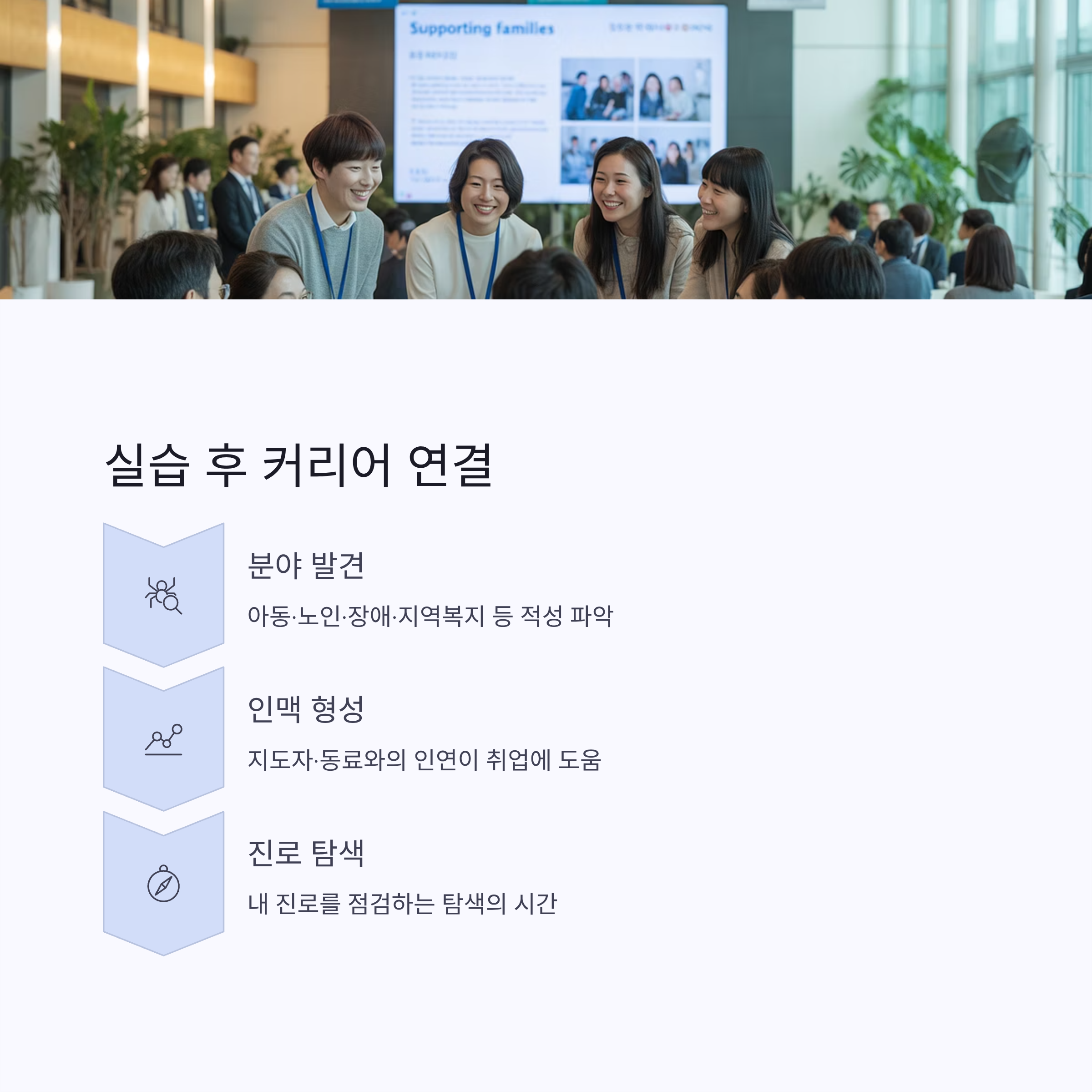 많은 실습생들이 실습을 통해 자신이 아동·노인·장애·지역복지 등 어떤 분야와 맞는지를 발견합니다.