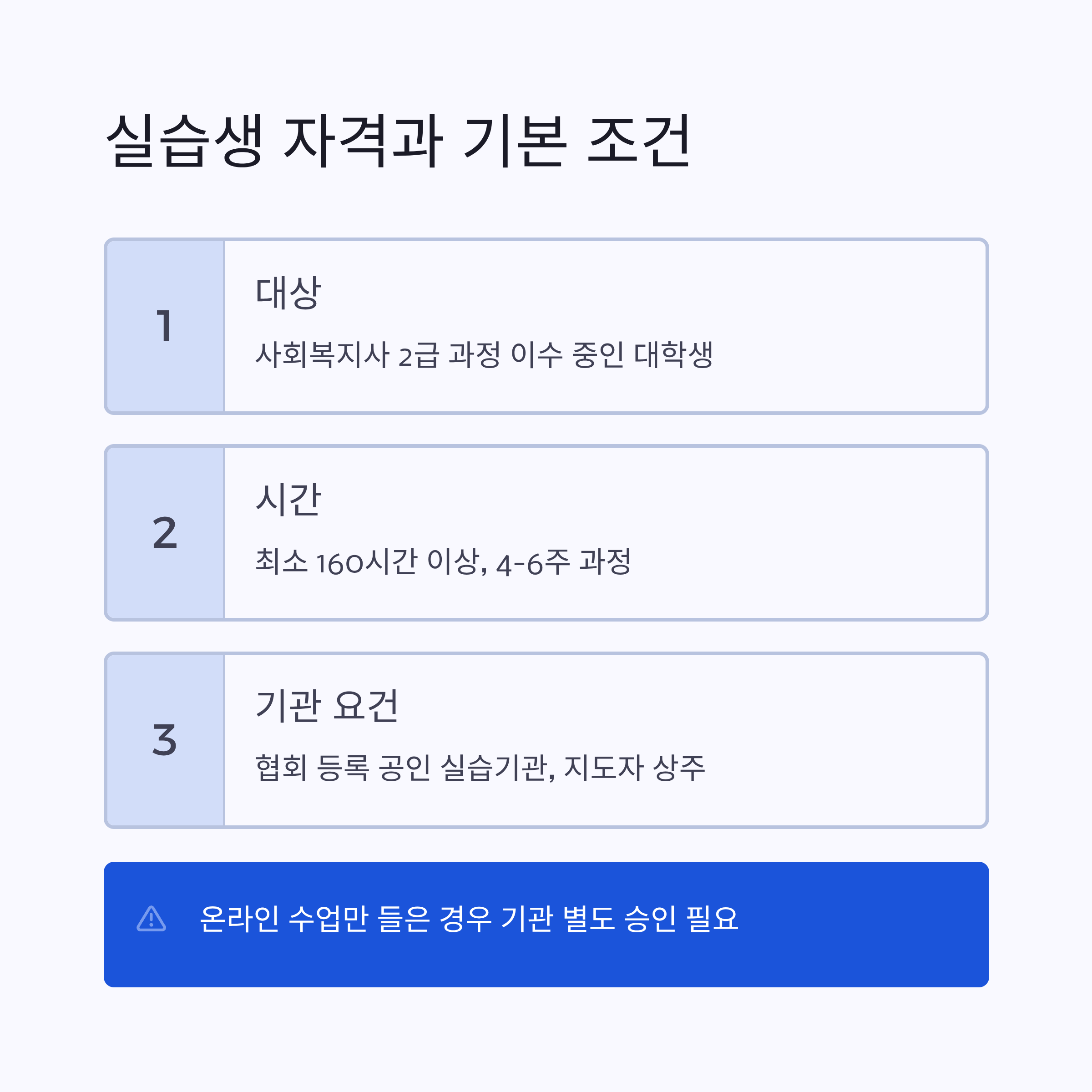 - 기관 요건: 반드시 한국사회복지사협회에 등록된 공인 실습기관이어야 하며, 실습지도자가 상주해야 함