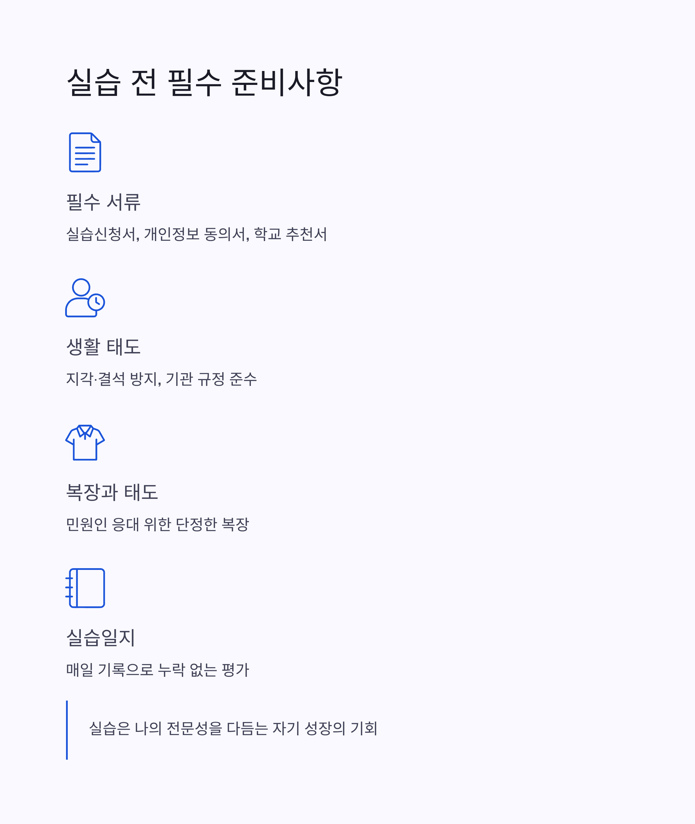 실습을 단순한 ‘교육 과정’으로 생각하지 말고, 내 진로를 점검하는 탐색의 시간으로 활용하세요.