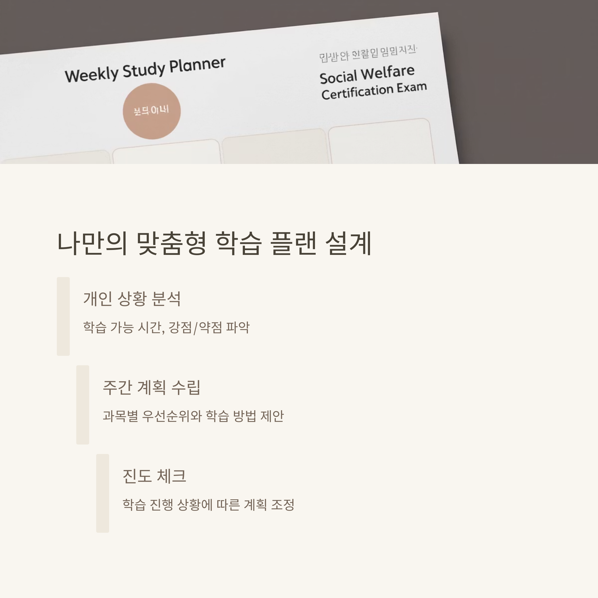 일주일 단위로 나누어 어떤 과목을 어떤 방식으로 공부할지