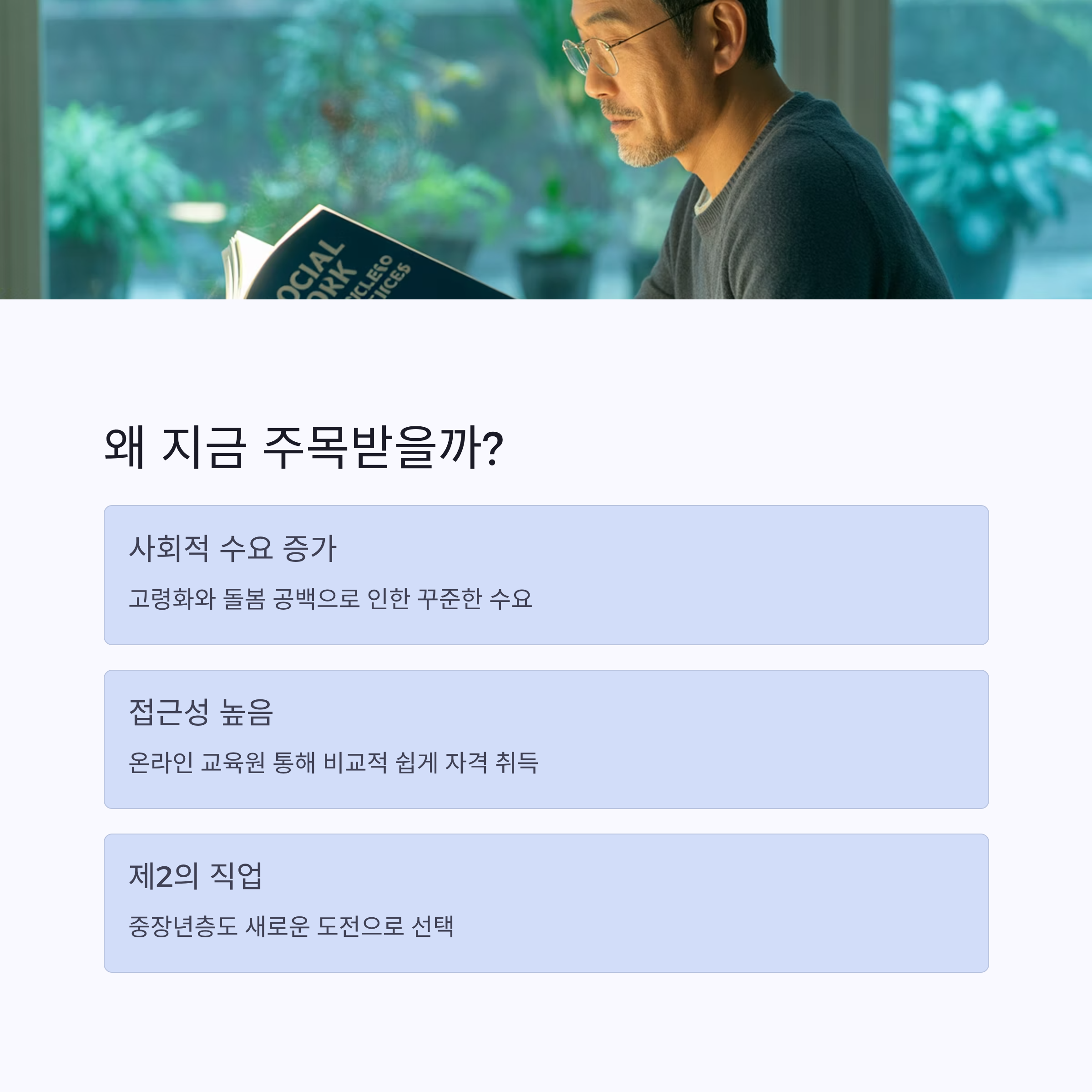 특히 사회복지사 2급 자격증은 온라인 교육원이나 대학 과정을 통해 비교적 접근성이 높아, 중장년층도 제2의 직업으로 도전하는 경우가 많습니다.