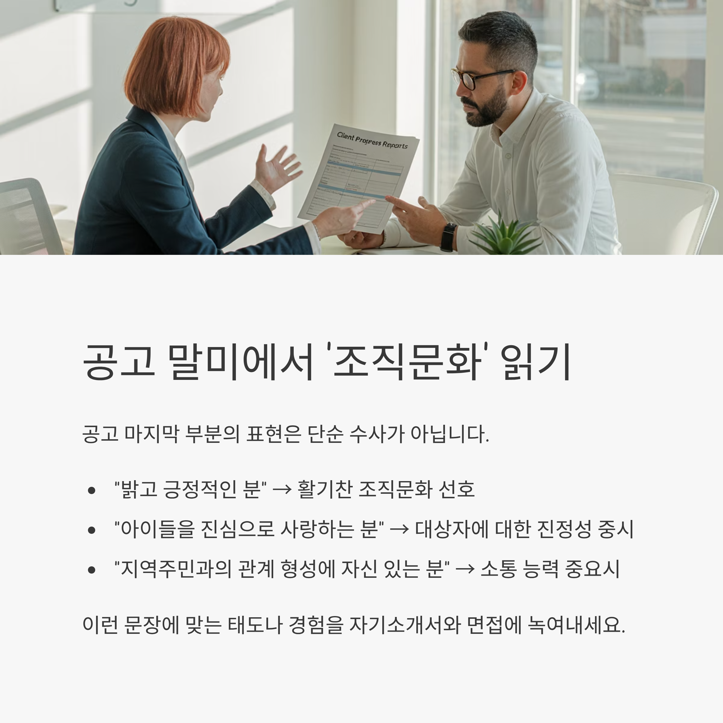"밝고 긍정적인 분", "아이들을 진심으로 사랑하는 분", "지역주민과의 관계 형성에 자신 있는 분" 등은 단순 수사가 아니라, 해당 기관의 ‘조직 분위기’와 ‘이상적인 인재상’을 암시하는 문장입니다.
