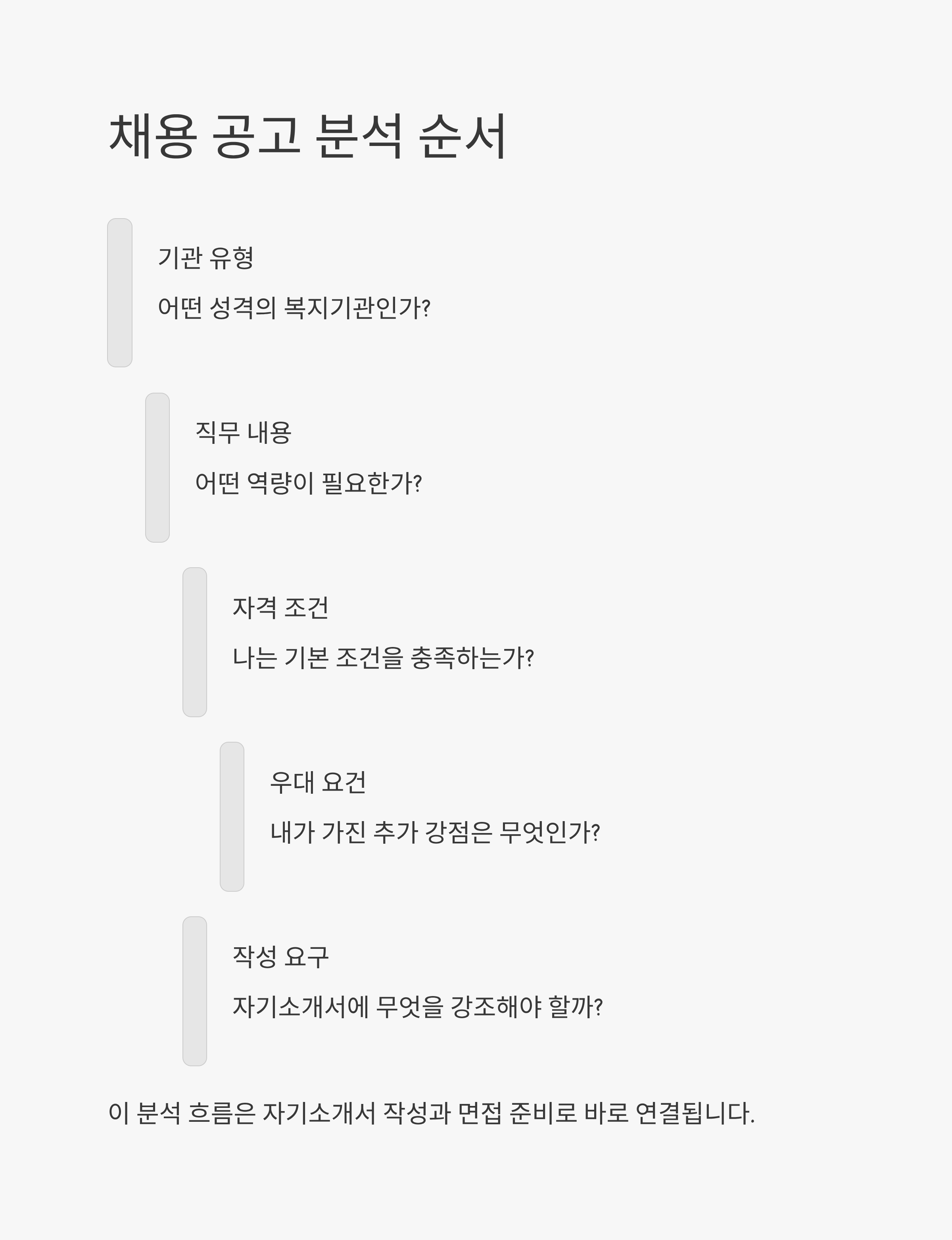 사회복지사 채용 공고는 모집 분야와 근무 조건만 확인하고 지나치기 쉽지만, 실제로는 기관이 원하는 인재상과 조직문화까지 드러나는 핵심 자료입니다. 이 글에서는 채용 공고 속 숨은 의도를 파악하고, 실질적인 자기소개서와 면접 준비로 연결하는 분석 방법을 안내드립니다. 단어 하나하나를 다르게 읽으면, 준비 방법도 달라질 수 있습니다.