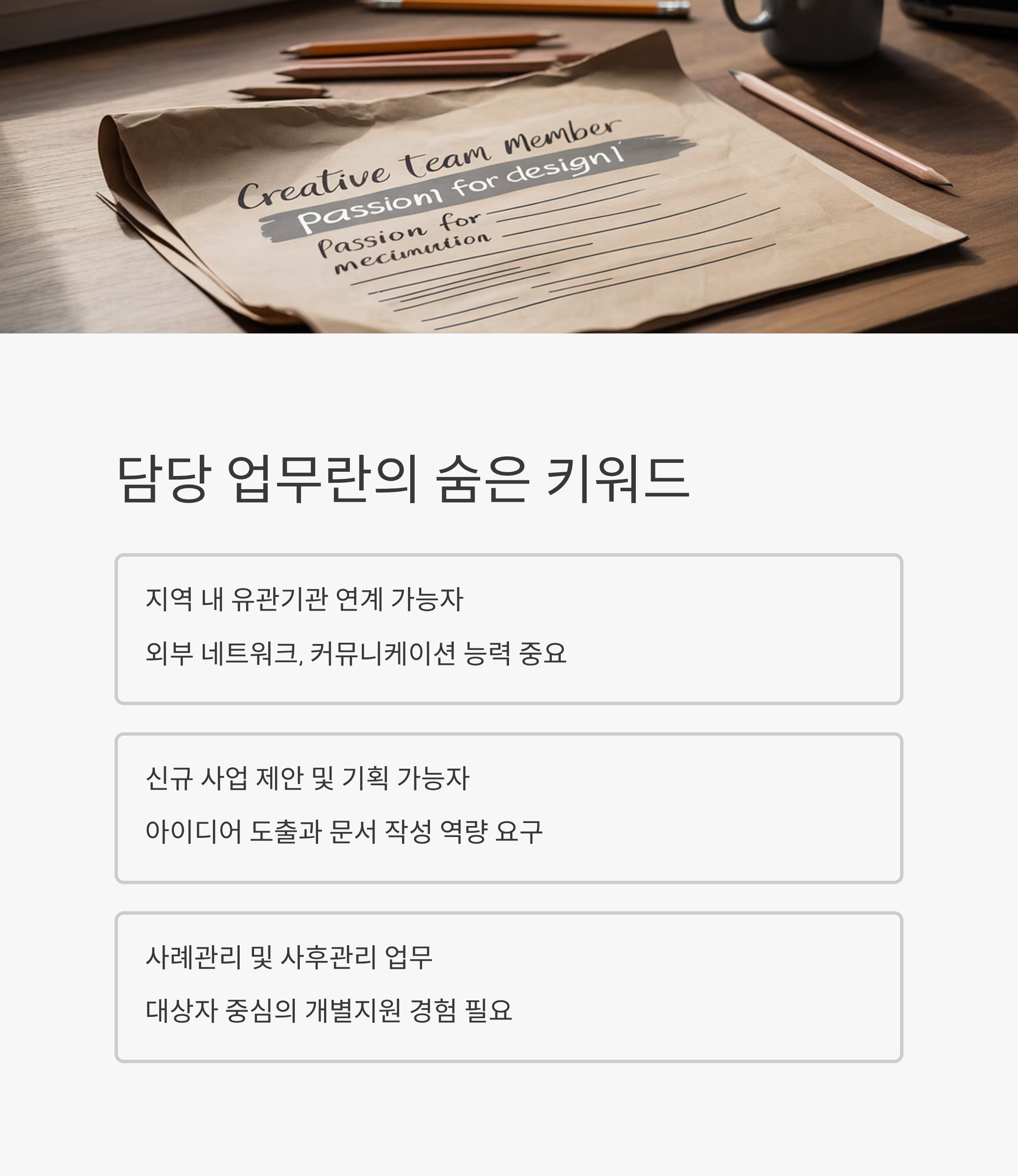 예를 들어 ‘사례관리 업무 가능자’라는 문장이 있다면, 그 기관은 ‘위기 가정’을 다루는 경험자나 관련 역량 보유자를 선호한다는 뜻입니다.