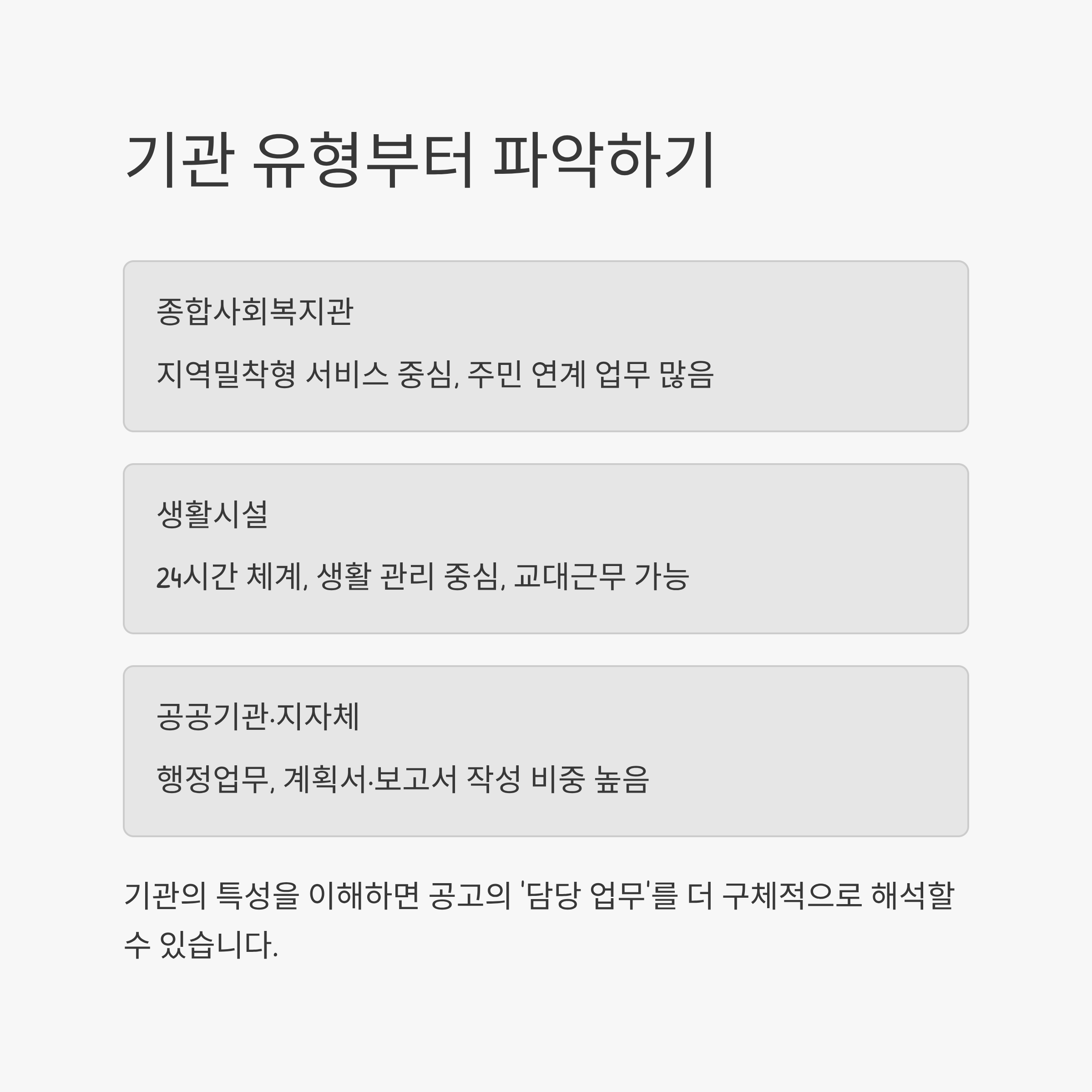 채용 공고를 보기 전, 먼저 기관의 성격을 이해해야 합니다. 같은 '사회복지사'여도 근무 방식이 다르기 때문입니다.