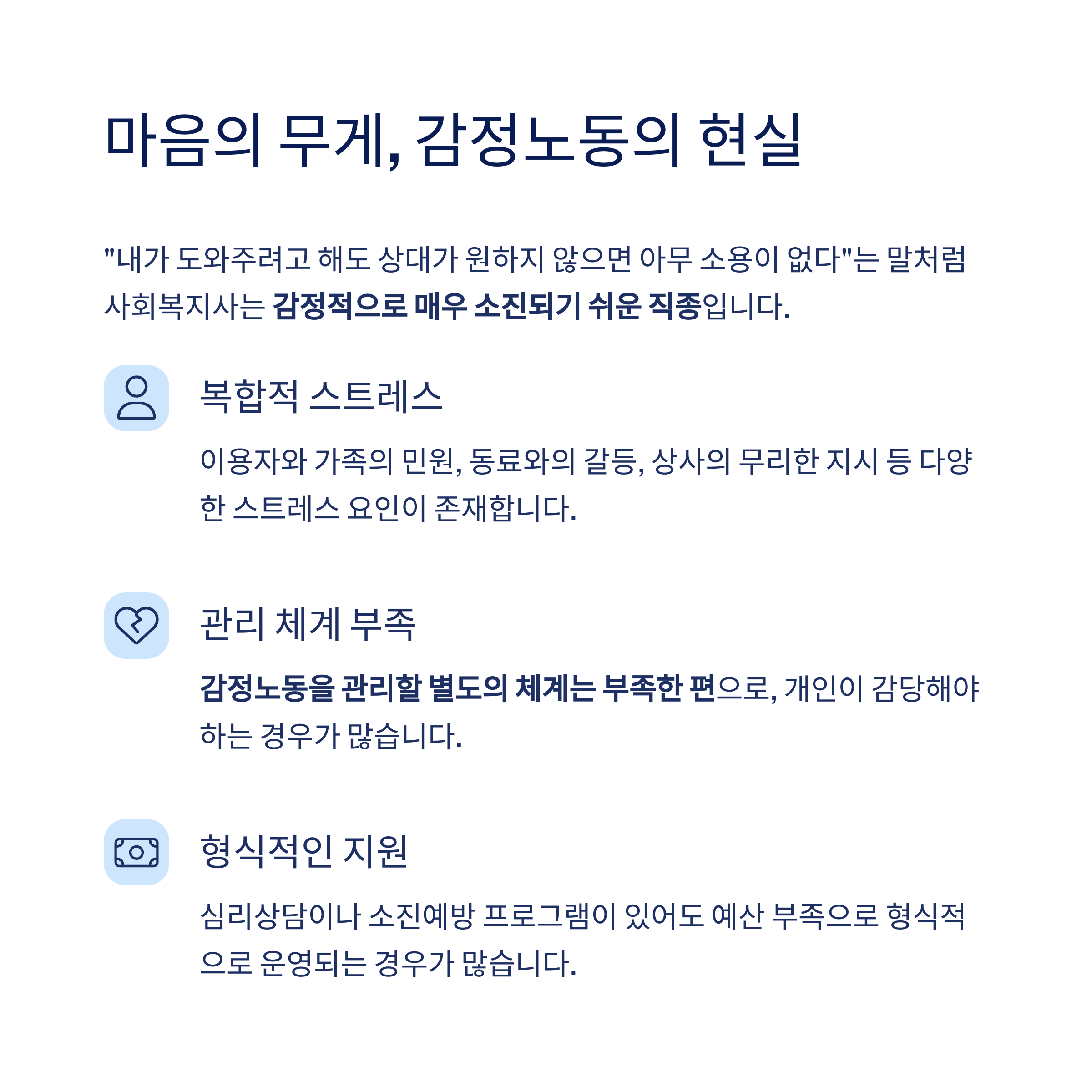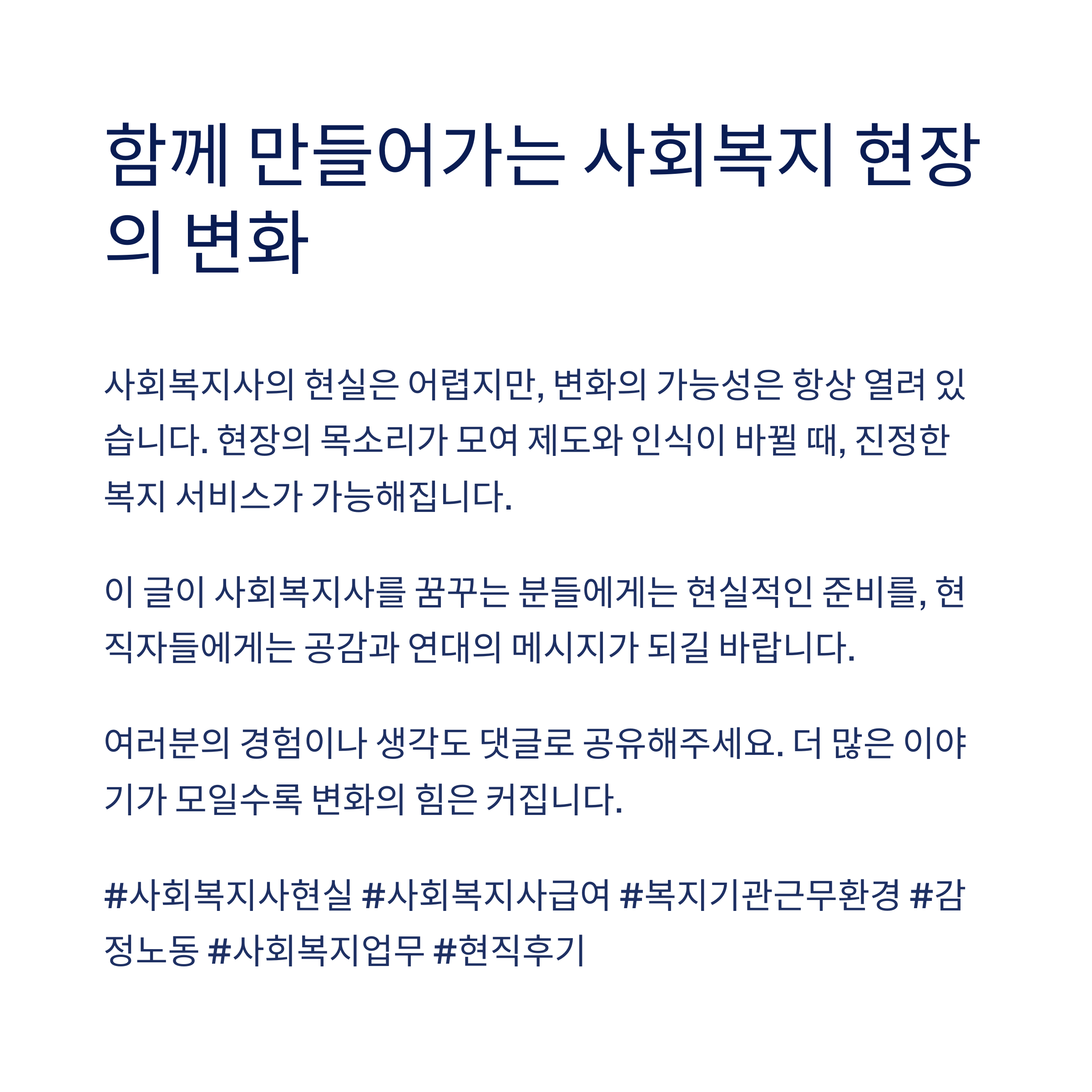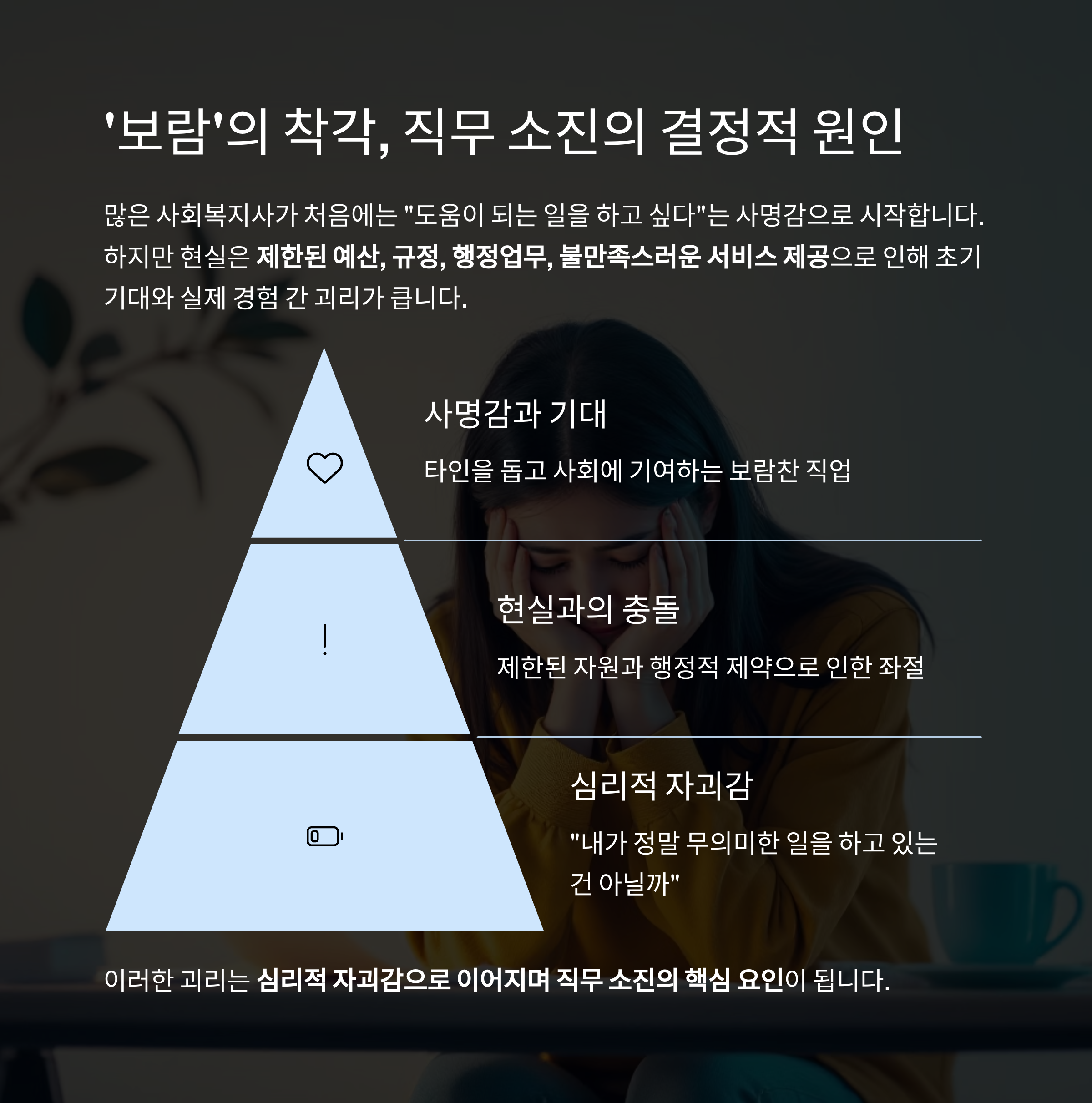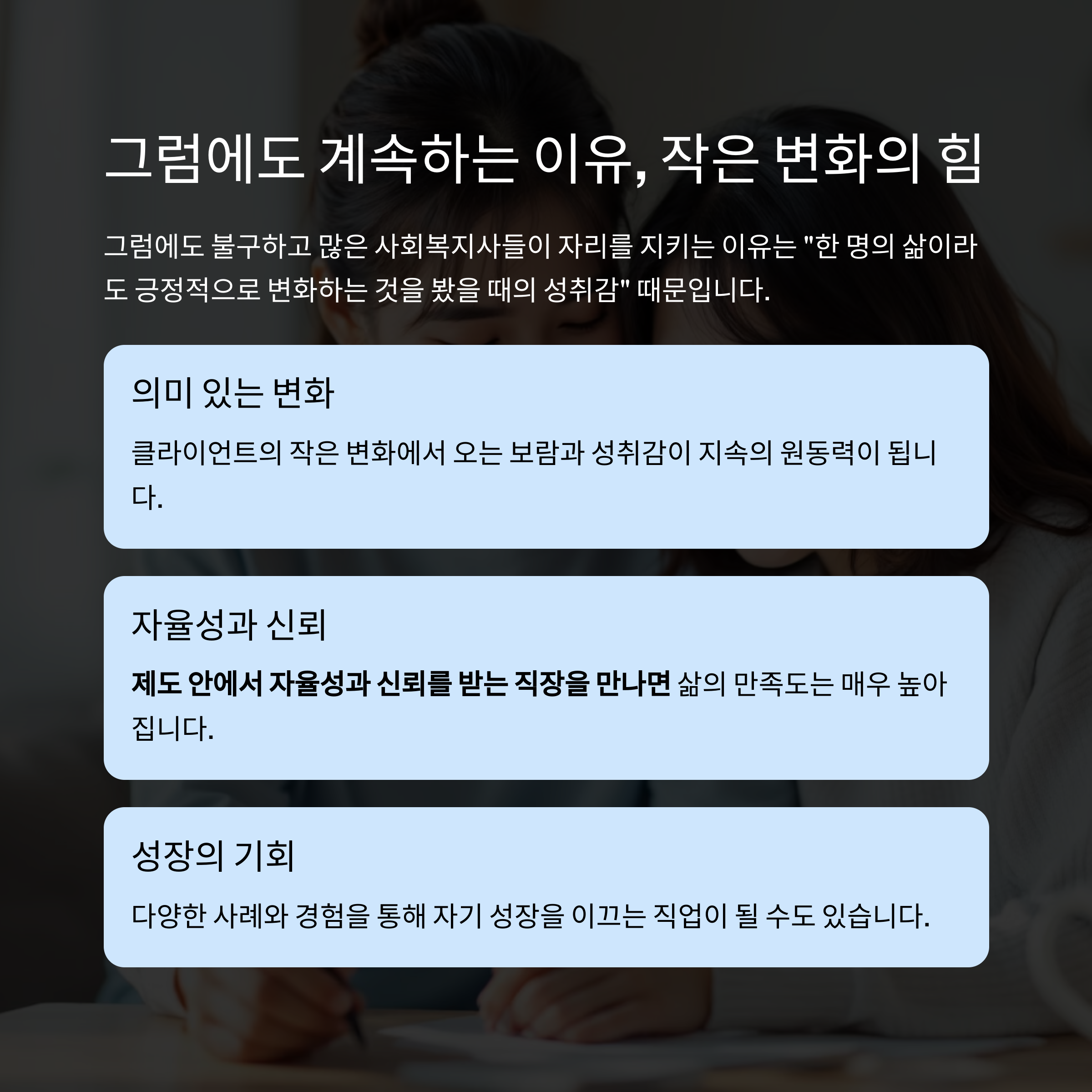 많은 사회복지사가 처음에는 "도움이 되는 일을 하고 싶다"는 사명감으로 시작합니다.