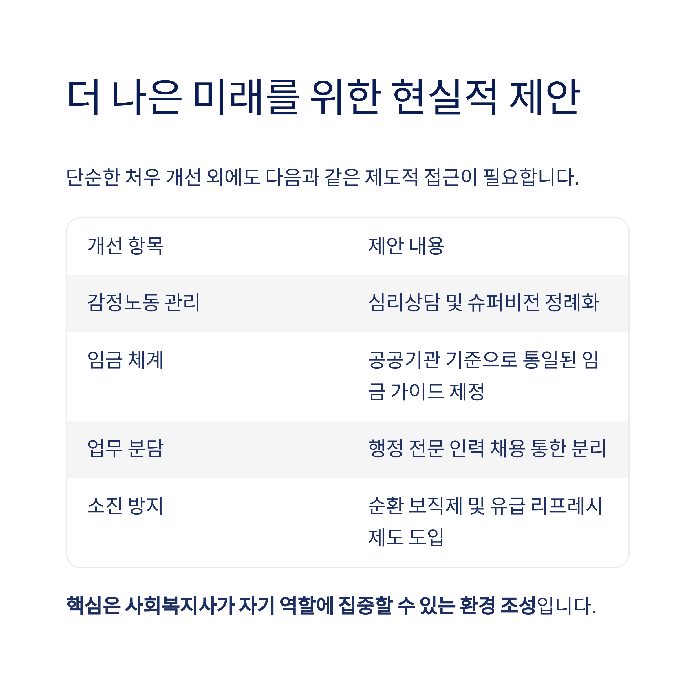 단순한 처우 개선 외에도 다음과 같은 제도적 접근이 필요합니다.