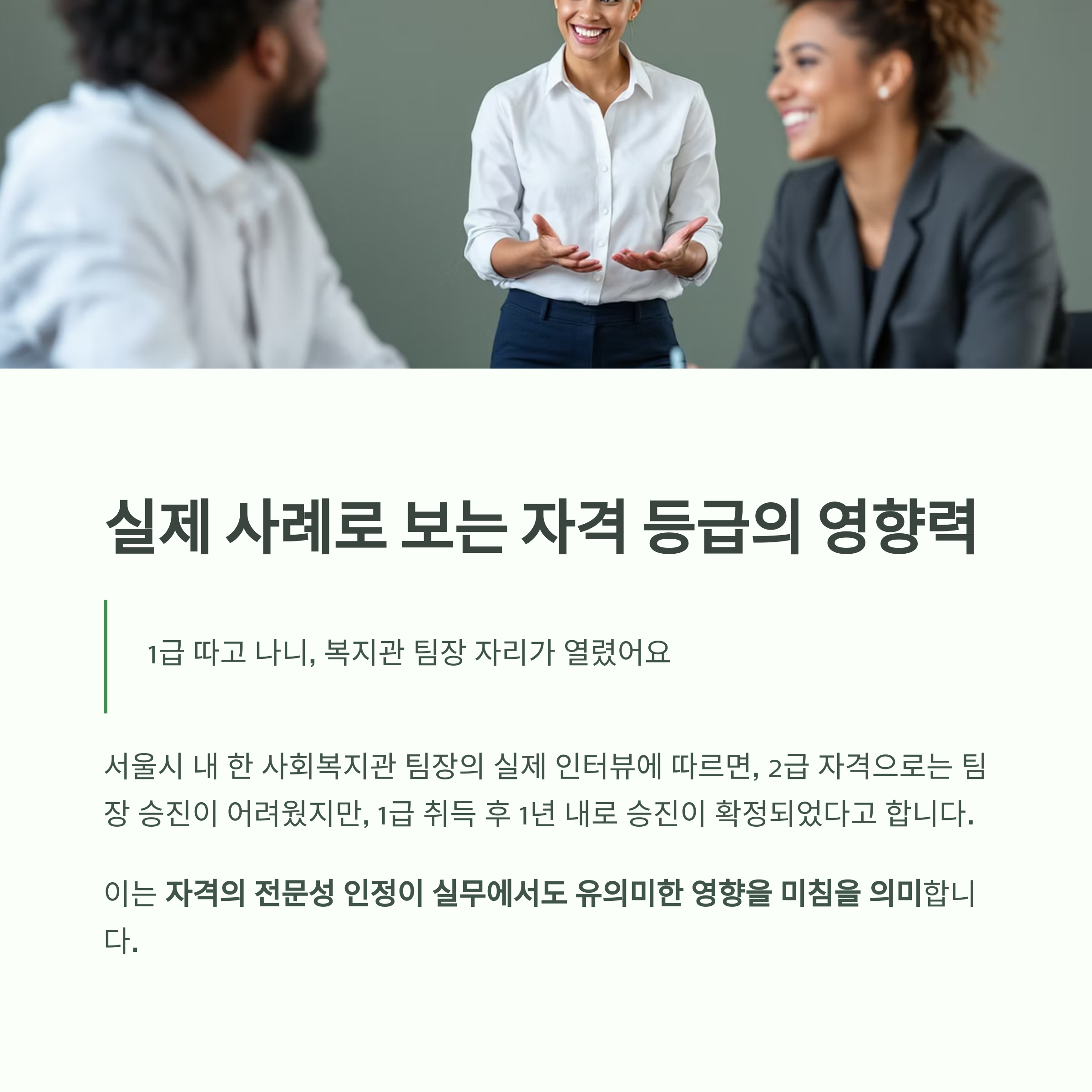 1급 취득 후 1년 내로 승진이 확정되었다고 합니다. 이는 자격의 전문성 인정이 실무에서도 유의미한 영향을 미침을 의미합니다.