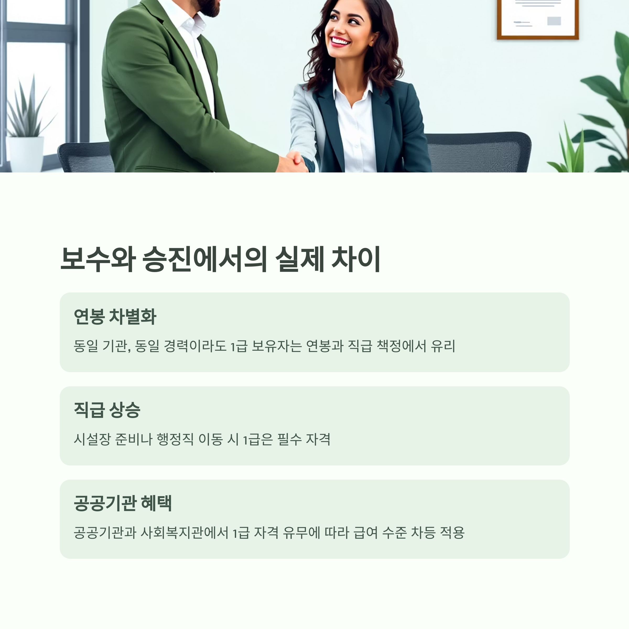 동일 기관, 동일 경력이라도 1급 보유자는 연봉과 직급 책정에서 유리한 구조입니다.