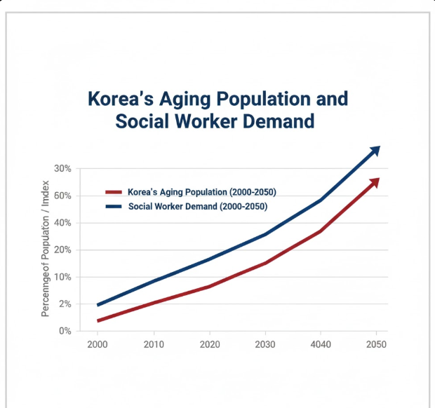 대한민국 고령화 속도(2025년 초고령사회 진입 예상)가 빨라지면서, 사회복지 서비스의 수요는 기하급수적으로 증가하고 있거든요.